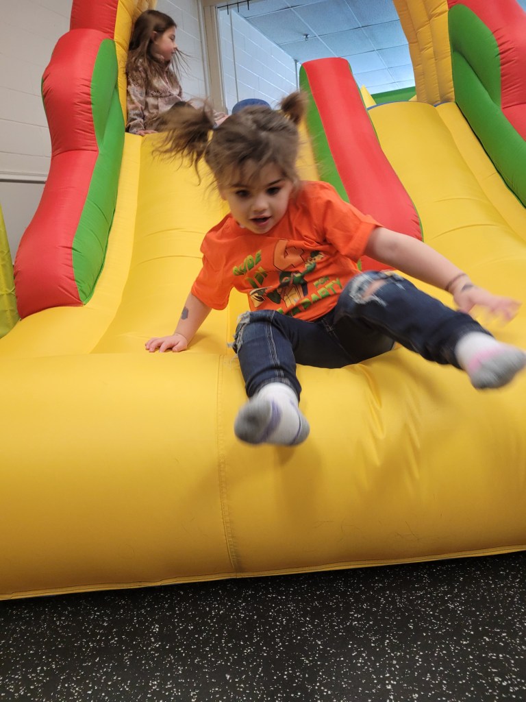 Inside the room is three or four bounce house. Some with hoops, some with slides and other just plain old bounce houses. It doesn’t seem like much for houses but we had my 4y birthday party here and we spent three hours here and easily could’ve stayed longer if we weren’t on a time block. We have gone before not as a party and idk if three hours would’ve been possible those times. The times other than the party, there were others but it was not super busy and there isn’t a guarantee there will be other kids there to jump with your kids so you might find yourself inside with them. My 11m old at the time enjoyed the houses when no other kids were inside or if the kids inside were a little gentler with jumping.