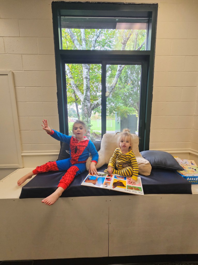 There is some random groceries and grocery cart. Some tunnels and tents for crawlers to crawl through. A small corner with few books.