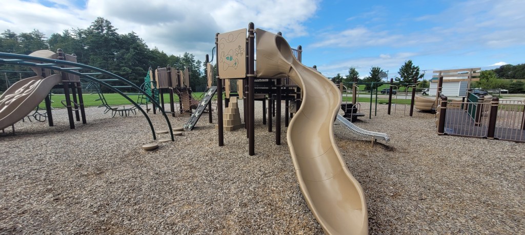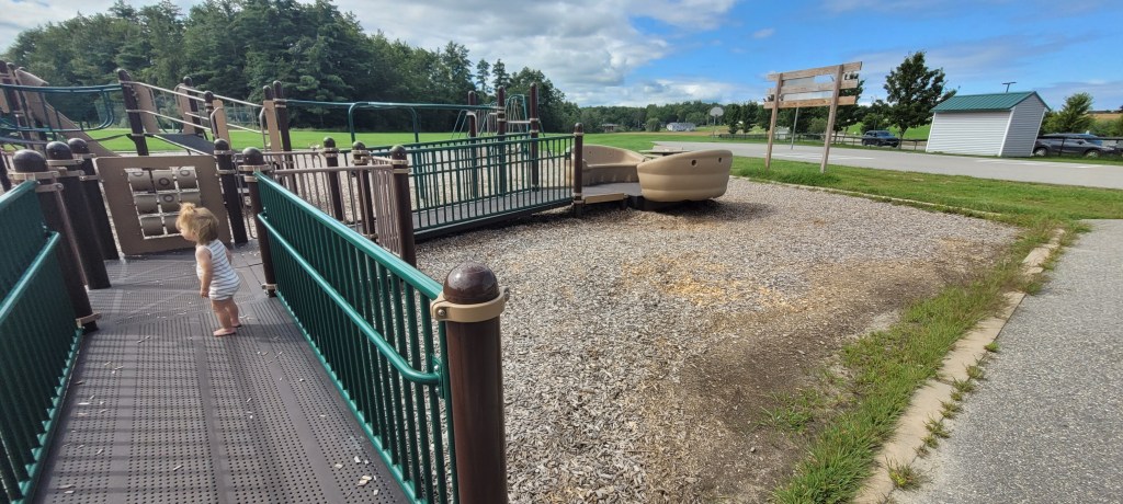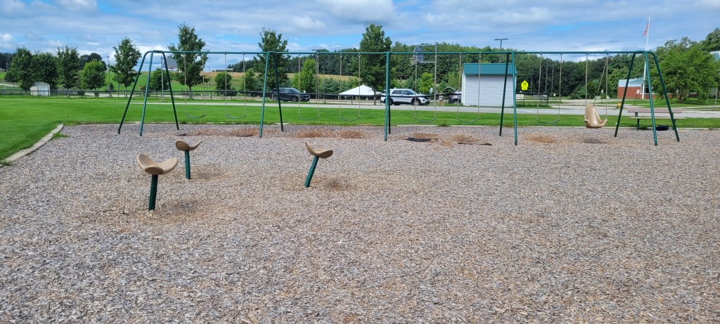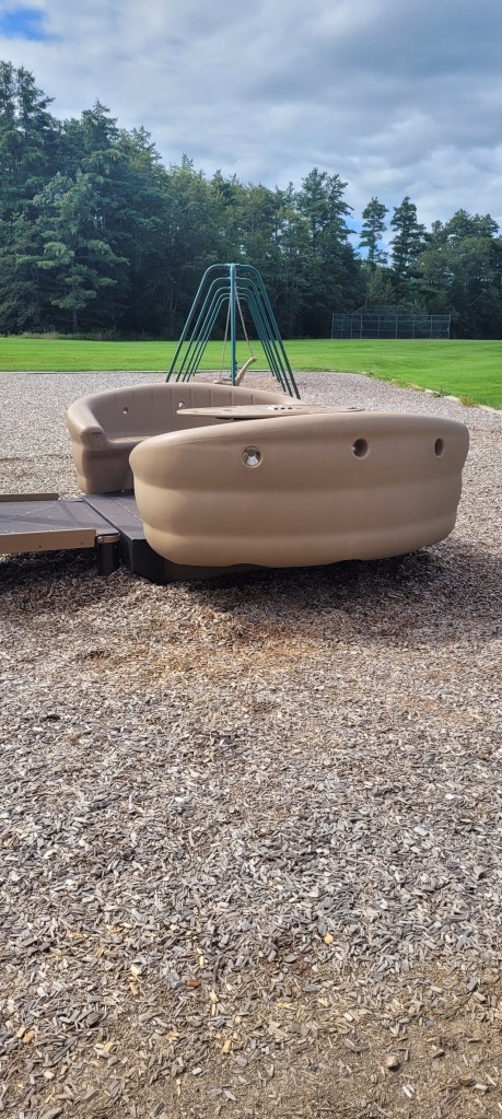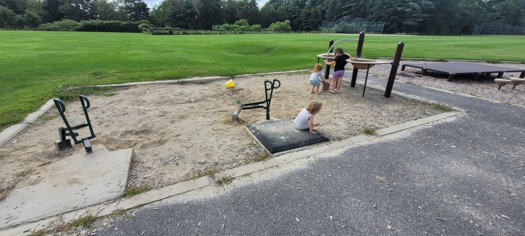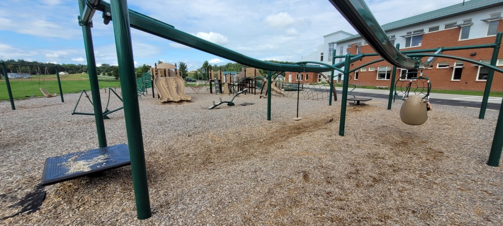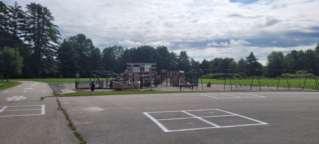 Around the playground are two swing sets, no bucket swings but there are two chairs swings (with no locks or buckles) and regular swings. There is a set of three spinning chairs that move with the weight of the child. On the concrete is a variety of ball games and hopscotch. The field here seems to go on and on and on and on and on and on and– you get the point, it’s a never ending field.