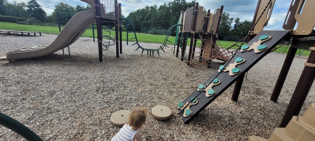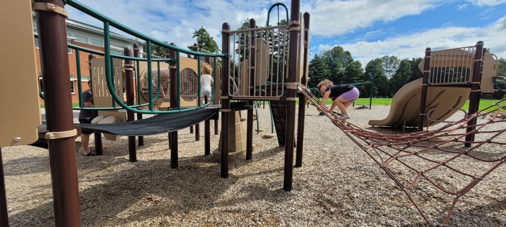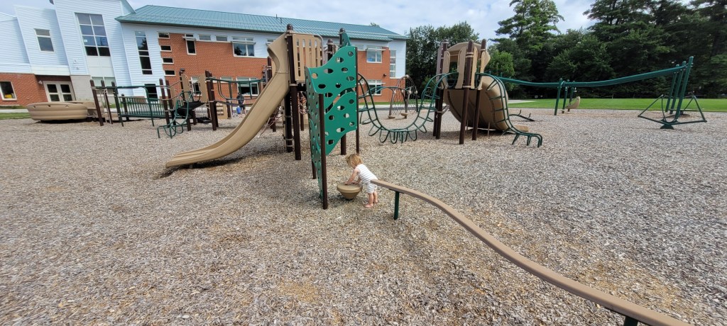 I mentioned there were a few disadvantages and those are: no bathrooms and little shade. Off to the side of the playground there are some trees and a smaller grassy area that parents could sit and watch from afar but this isn’t best if you have younger children or toddlers who need a little guidance on the climbing structures. Some of the playground is shaded only because the other parts of the playground are tall enough to shade the smaller parts, if that makes sense.