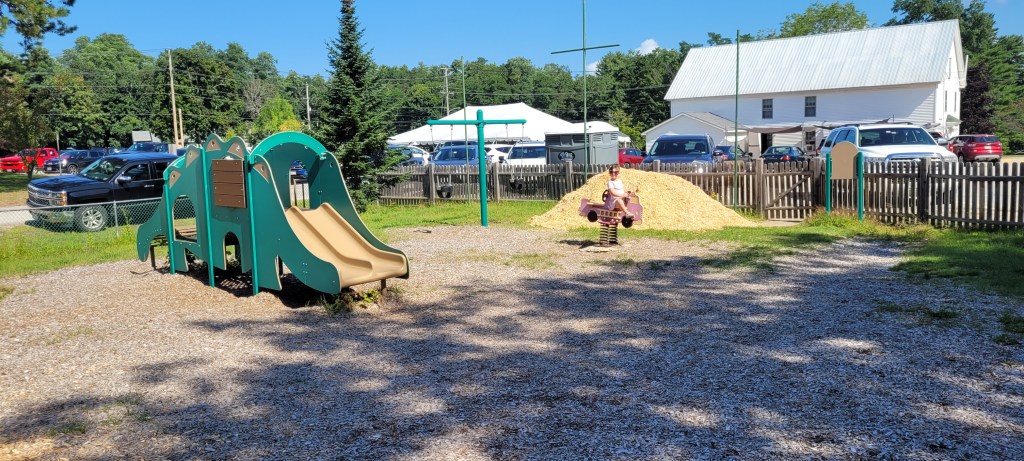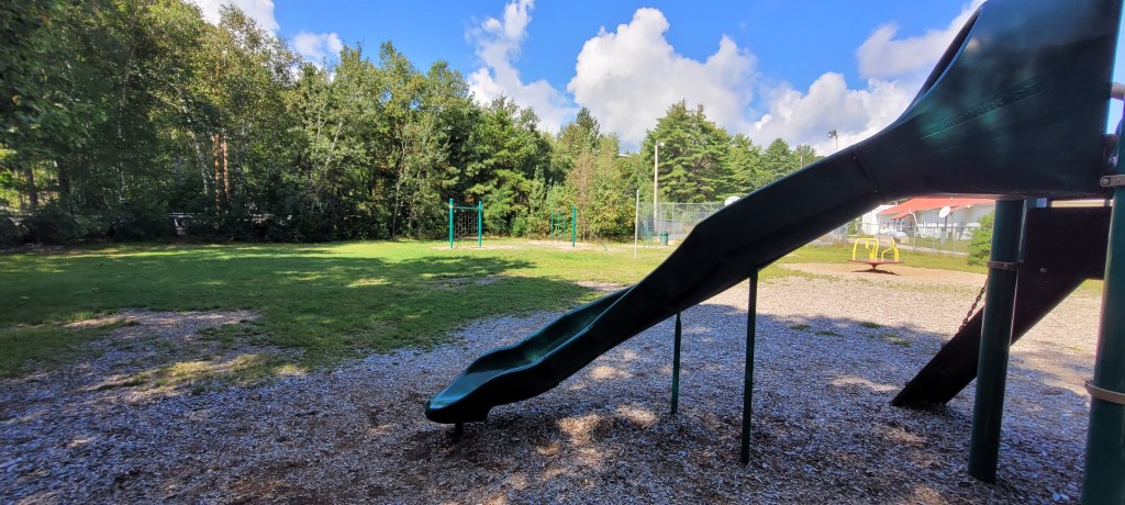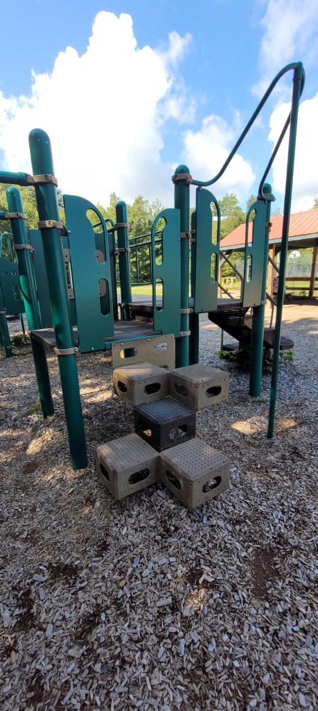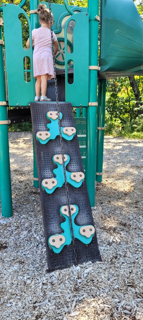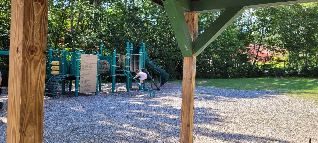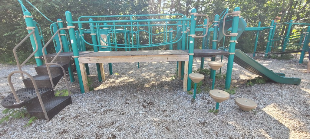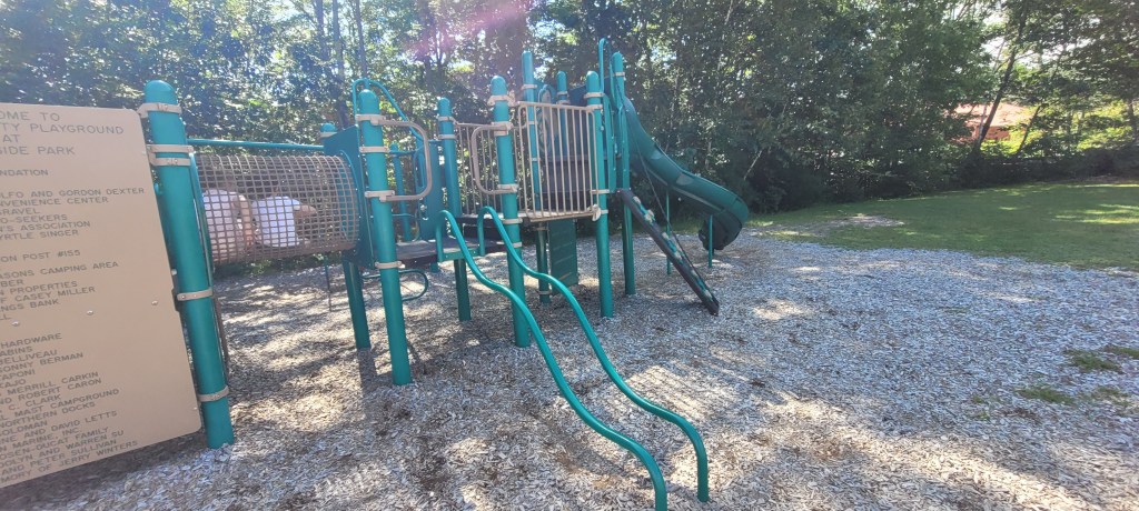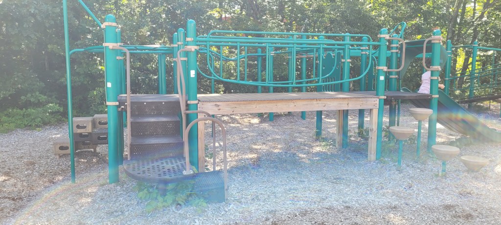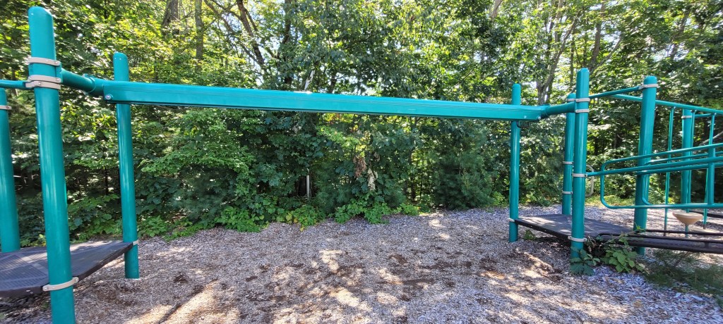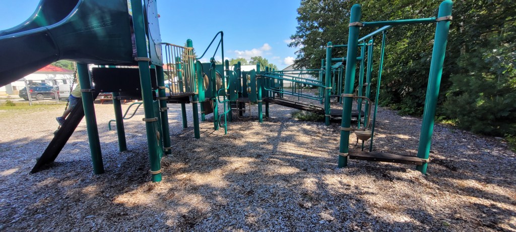 This is a pretty neat playground. It’s about 30m from Gray, ME. It has a bathroom, it’s shaded and there’s tables. All bonus points in book. Some of the equipment is definitely for older kids, like the various bar structures. My 17m could’ve maneuvered around all of it some supervision. My 4y did most of everything except the bars (she typically doesn’t like them). I definitely think this playground is worth checking out if you’re in the area or if you live nearby (30m is close enough for us).