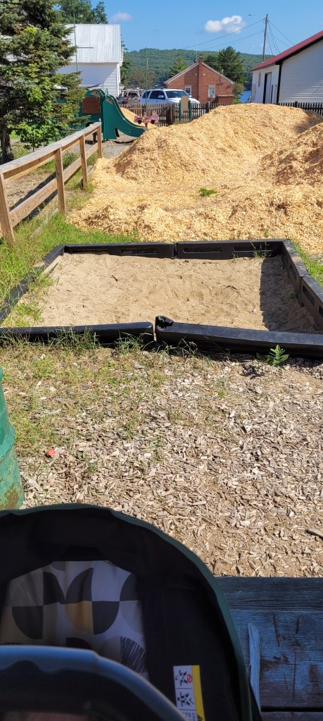 There are two covered tables. Next to them is a small sandbox that could use some maintenance. My kids who normally smell a sandbox from miles away didn’t so much as look at it. There were HUGE piles of woodchips piled around, unsure if the toen is planning on using it for the playground itself, but my daughter and the other kids were using them as mountains to climb, jump and slide down.
