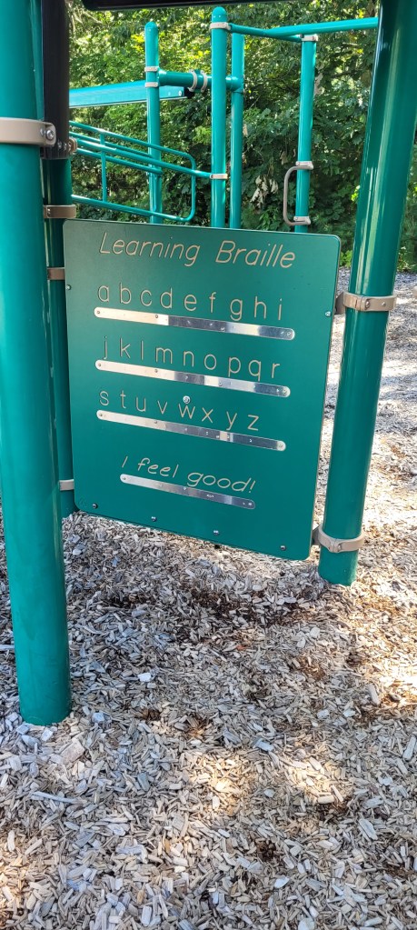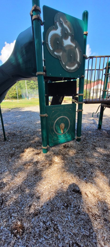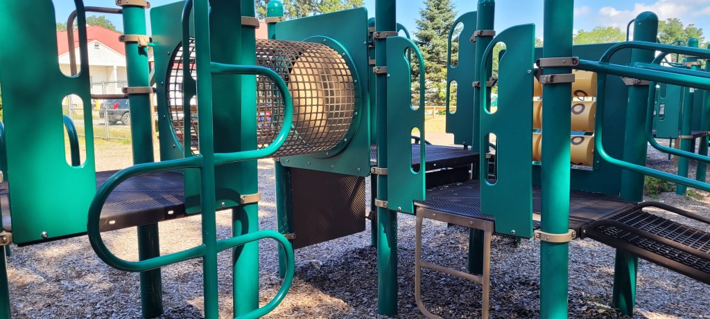 Should your kid go to the other side of the playground they go up by multiple ways. One way is a ramp towards the back near the various monkey bars and handle bars. If they go up the ramp they’ll come to a tic-tac-toe game to play. Another way up is a larger curved plank ladder. Both the ramp and the ladder lead to a see through metal tunnel. Through the tunnel, kids will come to two curvy bars to get down (or up) by hands or almost a crawl like movement. Across from this is a alternating foot ladder. Straight ahead from the tunnel is the curved slide. At the top of the slide are some turning gears. At the bottom of the slide is a double sided board to learn braille.