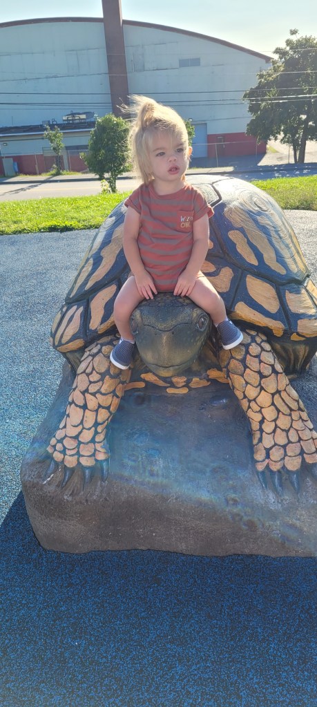 You walk up and immediately there are drums and tubes for music making. A couple are broken but the ones that work kids enjoy! The second thing you’ll notice is art work (most call it graffiti) lining the sidewalks. There is a seated merry go round when you immediately step onto the foam turf. Behind that are three spinning seats that move with the weight of your child. In the middle of the turf is a few tables shaded by one of those tent like covers. Around the edge or the turf is a metal beaver and metal tortoise for kids to climb onto. There’s also a fake rock structure, with fake bugs planted on it and a little walk through. A recently added area is a water mister. There’s only one but it covers plenty of area especially on a windy day. I found kids here a lot. It doesn’t get them soaked but it definitely will cool them down. This is also shaded by a umbrella type cover. There is swingset with a few seated swings, a couple regular swings and some bucket swings. The squeak very very loudly. Not a deterant but certainly not pleasant.