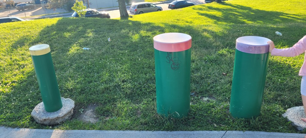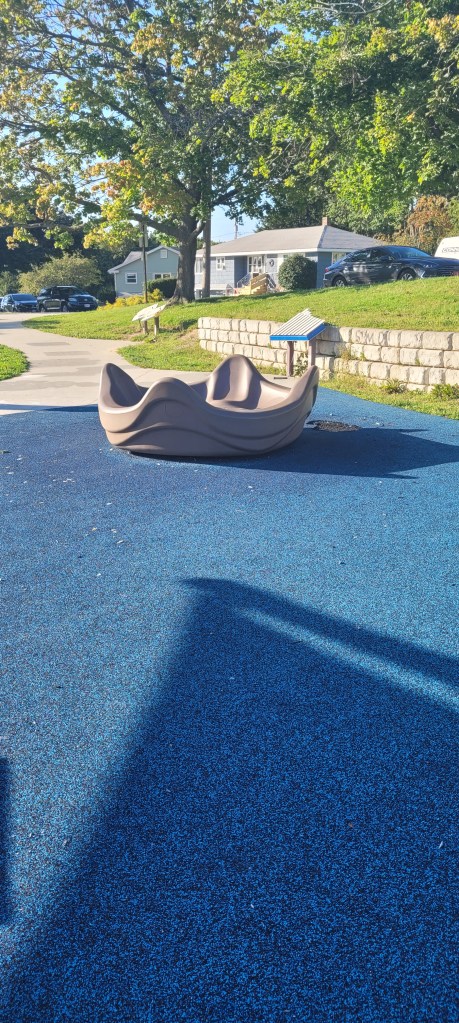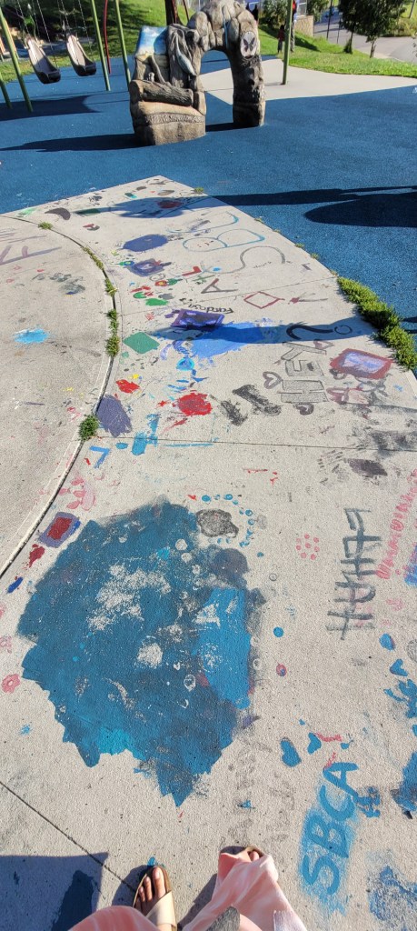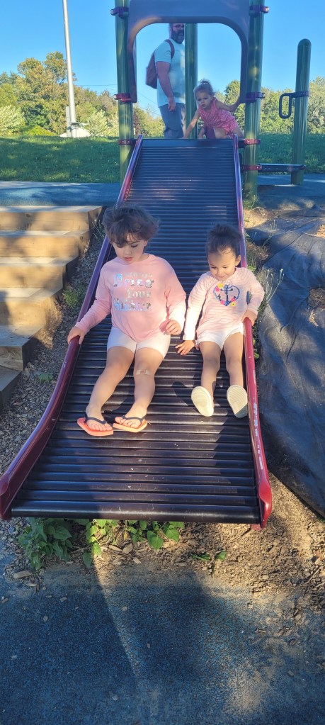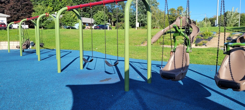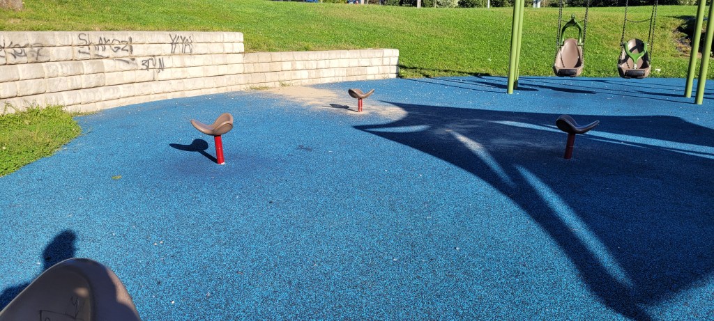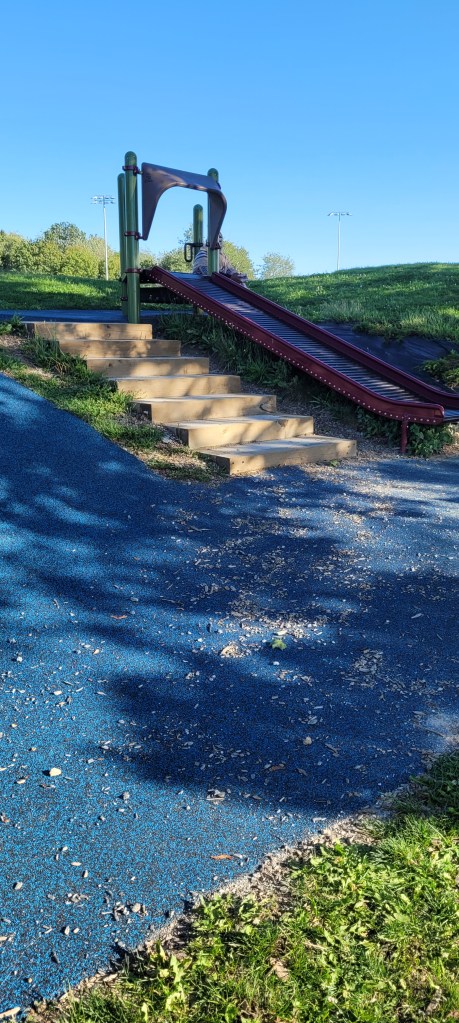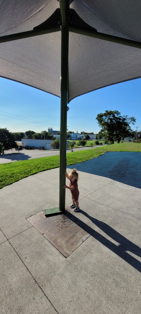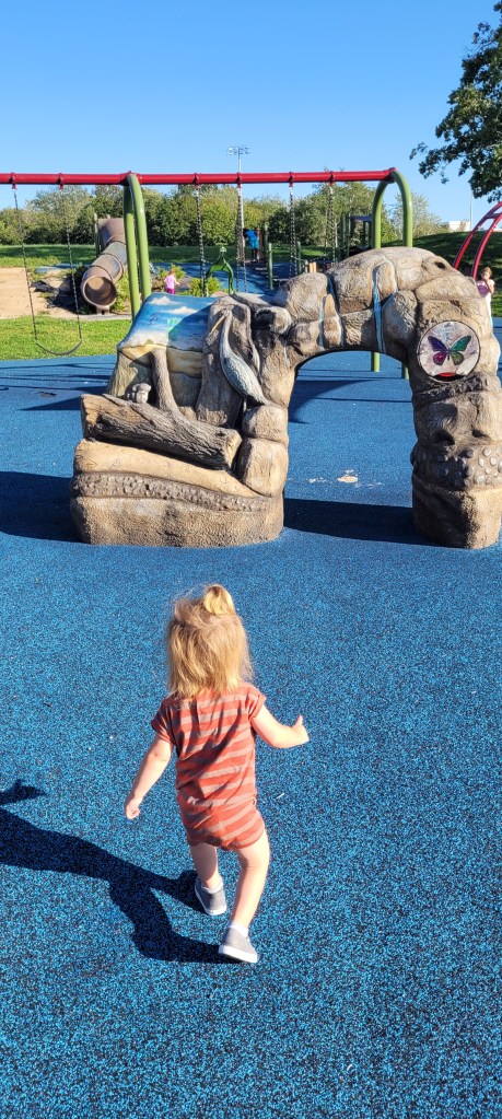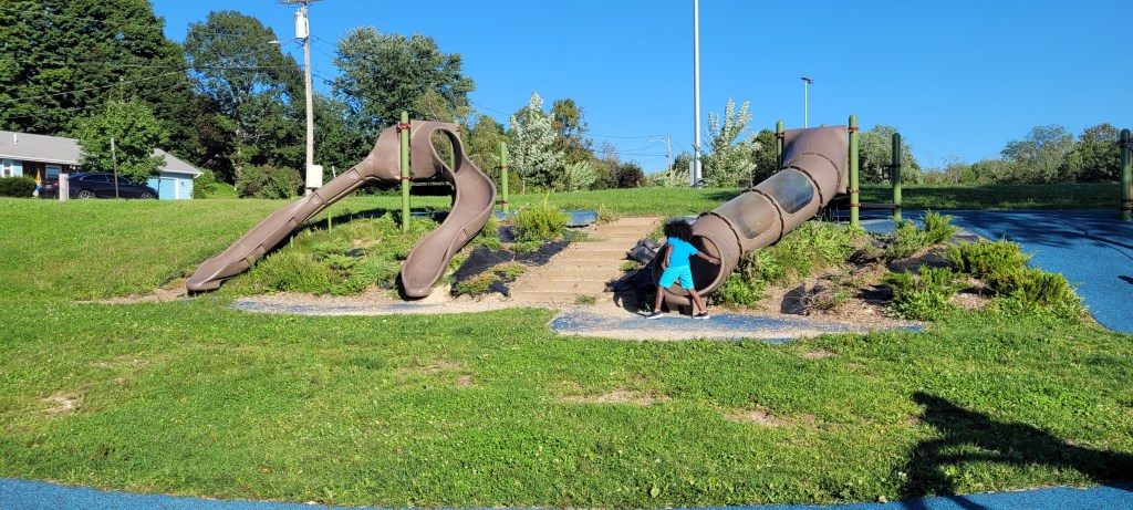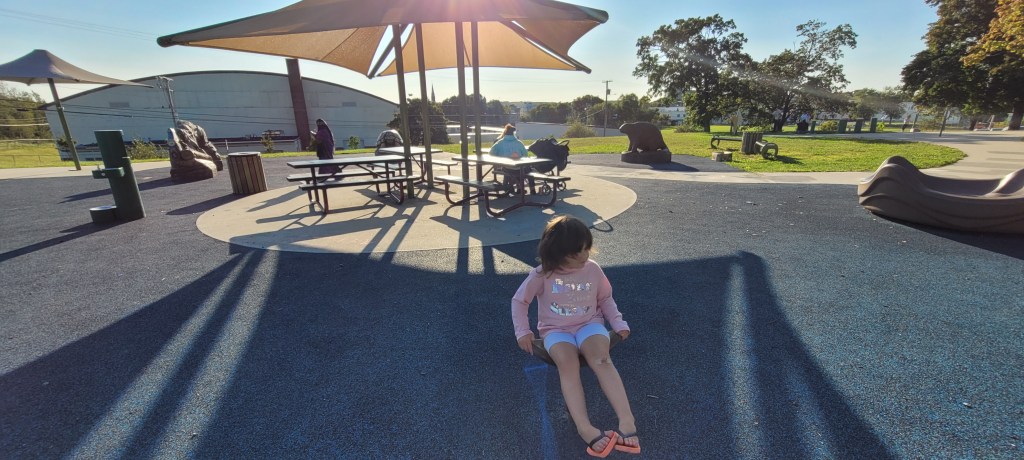 There is some shade but not a lot. I also saw some portable pottys but they were quite far away across the street in a gated field. There were some water fountains that didn’t work. Heavily populated by honeybees, at least near the trashcan near the tables in the middle. I’ve been when it’s only us at the playground and I’ve been when it’s busy. I wish I could tell you when to go for either but it’s been so sporadic. Our recent visit was taken over by teenagers or young adults who were rolling and smoking blunts. Yes. On the playground. With young kids present. They also were horsing around stomping on the slides as their friends slid through. Yelling obscenities.