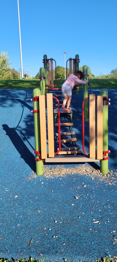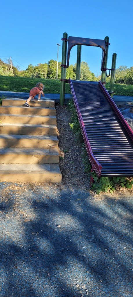 Behind the swingset is where the slides are. They are sort of built into the hill. The furthest to the left is a double curved slide. Kids can walk up the hill or steps to get to this slide or any of the slides. The slide in the middle is a tubular slide with some windows along it. To the right of this is a ladder suspended on ropes as another means of getting up or down the hill of slides. Younger kids can do this but toddlers ma struggle as it wobbles. There is one study step in the middle of it but everything else moves. The last slide on this hill is one of those rolly ones. I swear I didn’t plan on my kids spending a half hour on this slide but they did. Both my 17m and 4y could not get enough of this slide. There are steps near by it to climb or you can walk up the turfed hill.