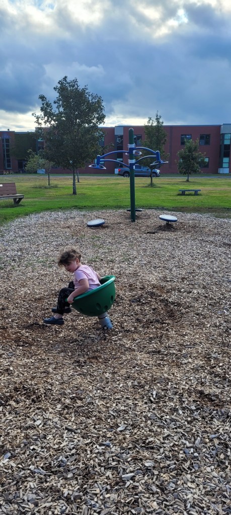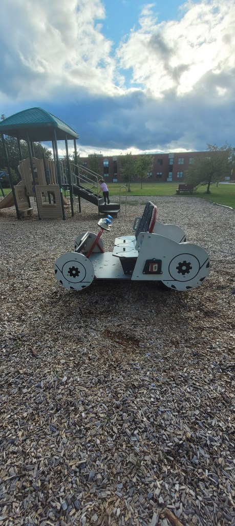 When you walk up to the playground, you’ll first see two stand alone cars for kids to climb in and either drive or be a passenger. Also on the perimeter of the playground is a spinning chair which spins with the weight of the child. Some spinning circles at various heights with spinning wheels above are next to the spinning chair, kids can reach up and spin around by holding on with what arm strength they have. Mine have none so this wasn’t entertaining for my 4y and 18m. There is a hole rock wall climbing structure next to that which was pretty popular. My kids always love these things. Lastly surrounding the main playground structure is the swing set. The swing set has three or four regular swings and two baby swings.