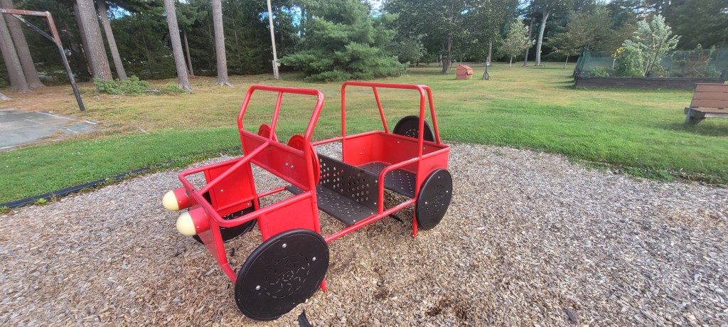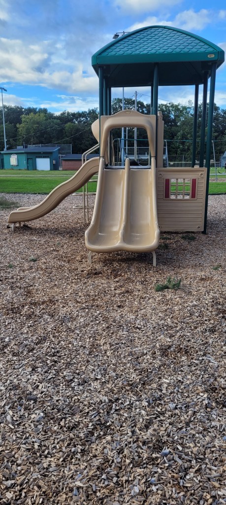 The main structure has a little window for some excellent pretend play. We used it as a mulch dinner restaurant. You can go up two ways. The first is the simplest, steps. The second way up is a cube shaped ladder. You can climb it from the inside or outside. When you get up there is a small double slide and a hilly singular slide. There’s a wall up here that would be cool if it wasn’t full of wood chips. It is a wall of gears that turn when you spin the handle. There is also a telephone, with one person on top and one person on bottom, to talk to each other. There’s also a seeing thing, if you’re on the bottom (the ground) you could look in and see to the top of the playground. Again none of this works because it’s filled with wood chips.