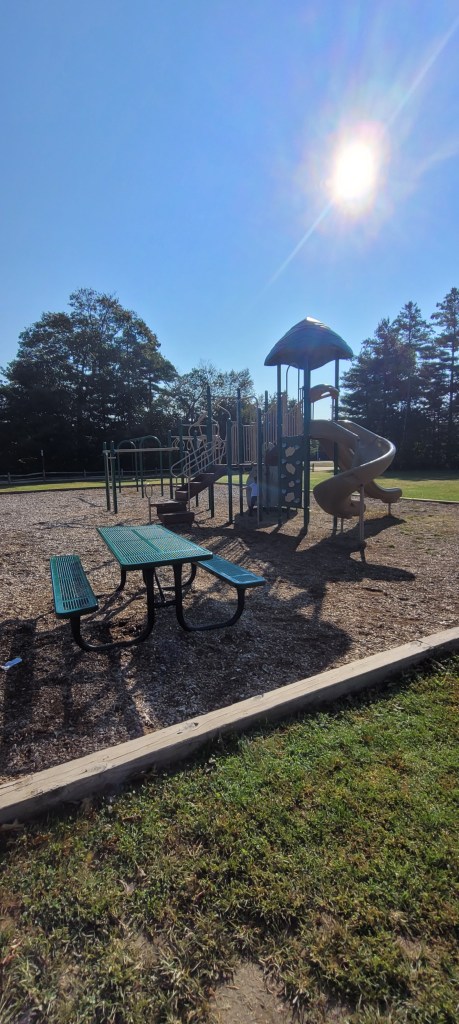 While writing this I realize the playground is on the smaller size so I’m not sure what captures my kids attention so much but we easily can spend 2 hours here, we did it today. They play on the playground for a while, then run in the huge field, sometimes with a ball most times just running free. My kids also like to play underneath the playground I assume because it’s mostly shaded under there so they take a break under there playing with woodchips, then the return to playing on the playground, repeat. I’ve been here more times than I can count and never have I seen more than one or two other families here. The bathrooms and the one partially shaded picnic table adds bonus points. This place is only 10m from me, so that’s the real plus for me. I recommend this playground for ages up to 6 or so, unless you’ve got older ones who would love the field. It’s not quite one year old friendly but definitely and toddler who has mastered walking.