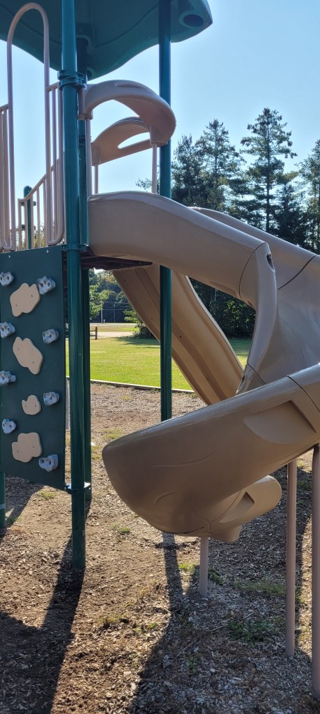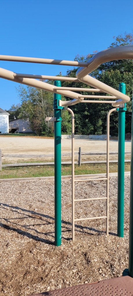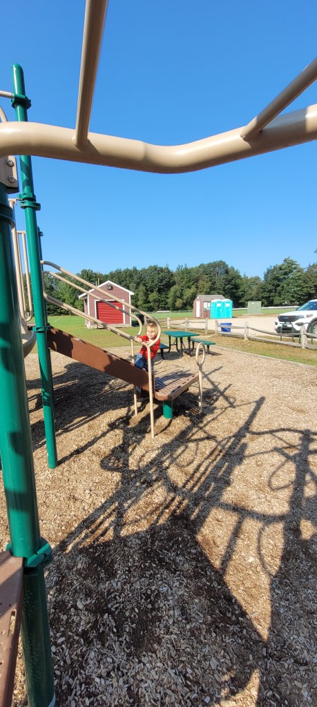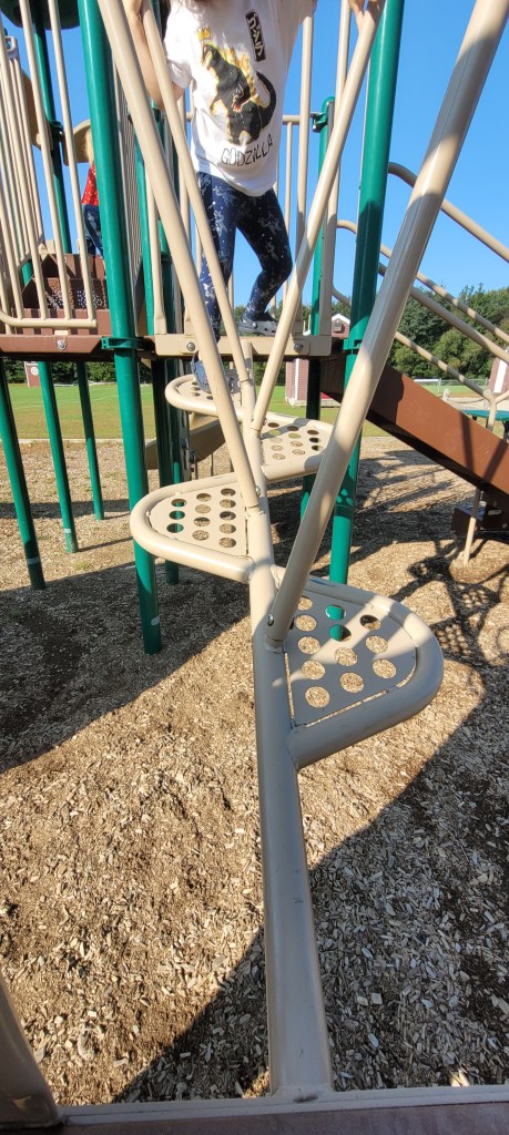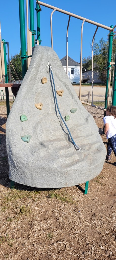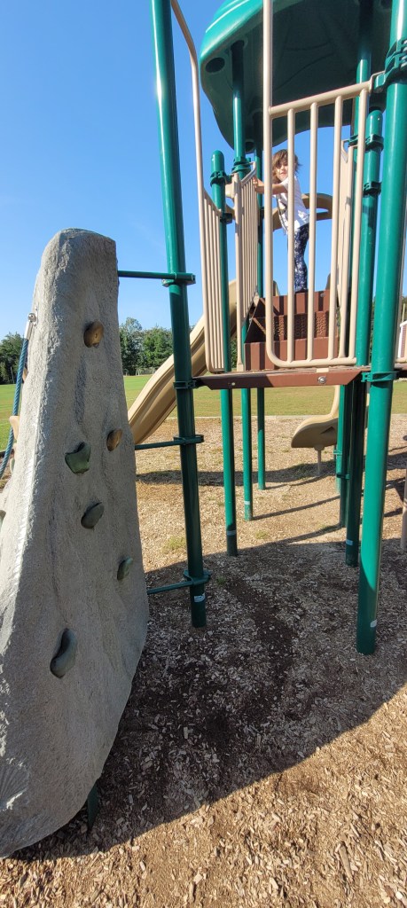 There are a few ways up to the top. The easiest is the stairs. Parents can easily follow their toddlers up. A tall flat rock wall is another way up- when I say flat I mean both, vertical and the rocks are those flat kind of ones where you really use finger and tip toe strength. Another way up is another rock wall except this one looks like a Boulder and there are bigger holds and steps and there’s a chain rope attached for added help. It’s kind of difficult for kids or toddlers to transition from the front on this to the back which requires another transfer up and over to the top of the playground. There is a fire pole opening near the stairs and the flat rock wall. There are also two more smallish openings at the bigger rock wall. The top of the playground sports one hilly slide and one twisty slide. I have giant hips and I can fit down both. Another opening near the stairs leads to this piece of equipment where kids alternate their hands and feet and sides on this almost climb through set of bars. It takes some practice and a watchful eye if you have a curious toddler. My 18m tried it for the first time today and after a few tries and a little help he eventually got the concept. He still wasn’t able to do it alone by the end but when I walked beside him to give support I wasn’t holding much of his weight, I more so guided him on what to do. I’ll post the video to my Instagram if you’re interested in seeing an example. Their are two sets of monkey bars at the end of the previous contraption. One set is the normal horizontal bars and the other are circular or some odd shape that literally go in a circle leading you back to the platform. Smaller kids may need help getting down if they don’t go back up the alternating climbing thing.