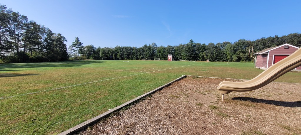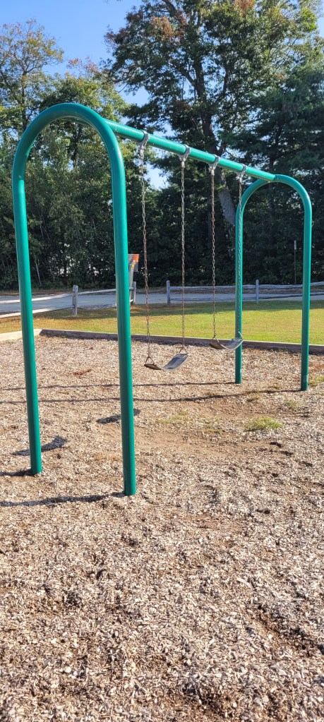 There is a picnic table immediately entering the wood post fence. There is a swing set with two regular swings and GIANT GIANT fields. Seriously you can let your kid run and run and not have to worry. There are some porta pottys next to the parking lot.