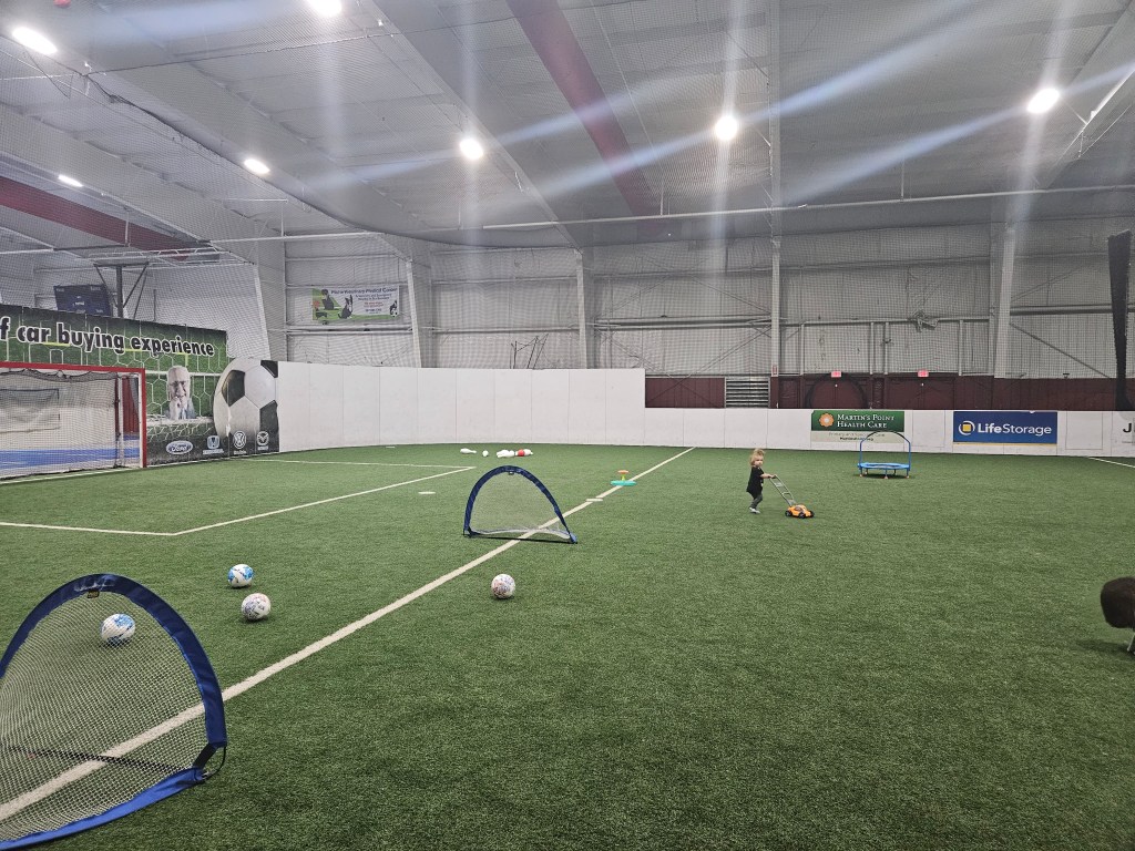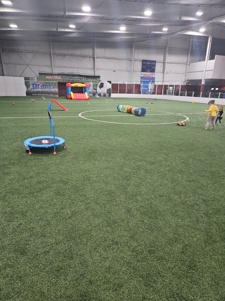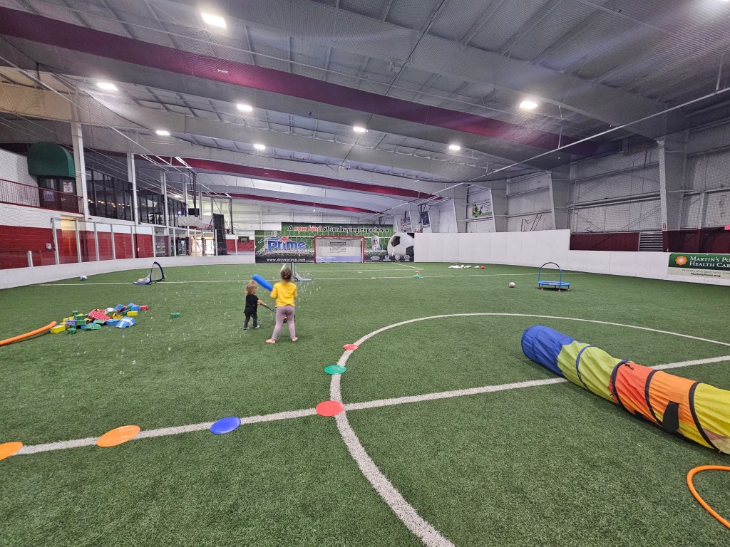 Mondays + Thursdays 9a-12p. $5 per kid, 1 and under is free! Big, enclosed green turned field. We’ve been many times for open gym and sports classes and each time the equipment is different at open gym. You may see a bounce house, wooden or cardboard blocks, various balls with soccer nets, tball sets, parachutes and ride on toys. It’s not well know so there maybe a kid or two to play with but we’ve been before and it’s been just us. My kids usually max out around two hours but it’s totally possible to stay for the full 3hrs. They have bathrooms and vending machines for snacks and drinks.