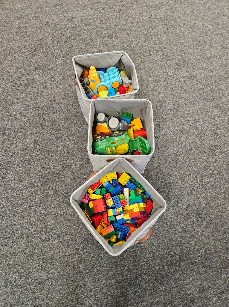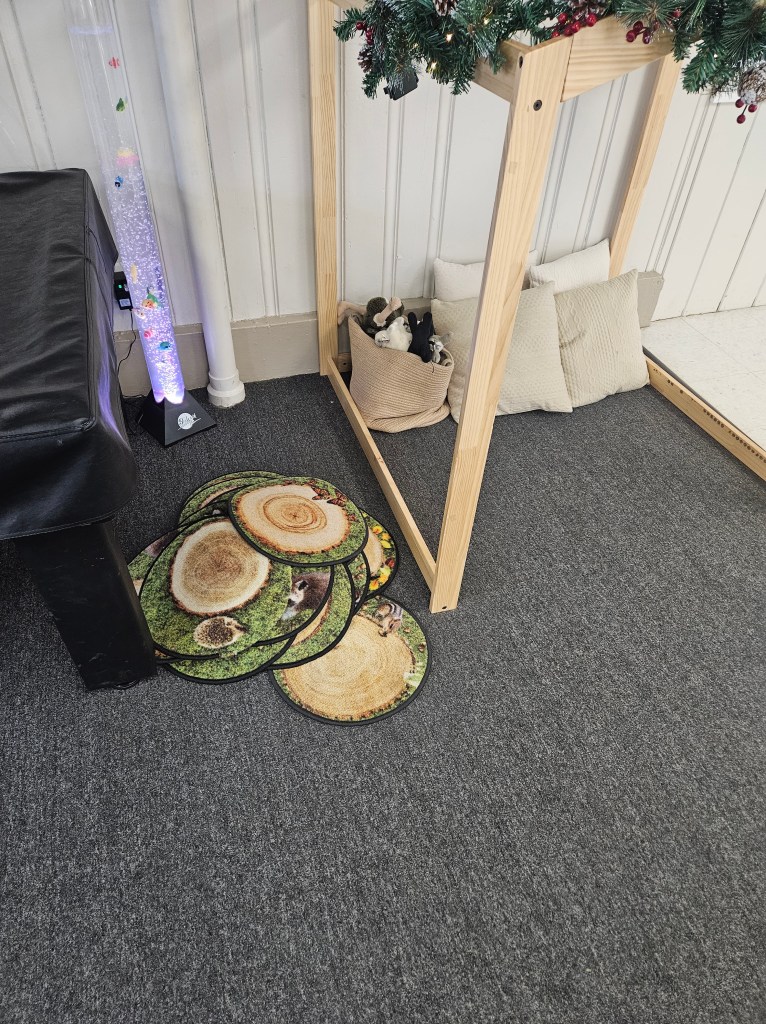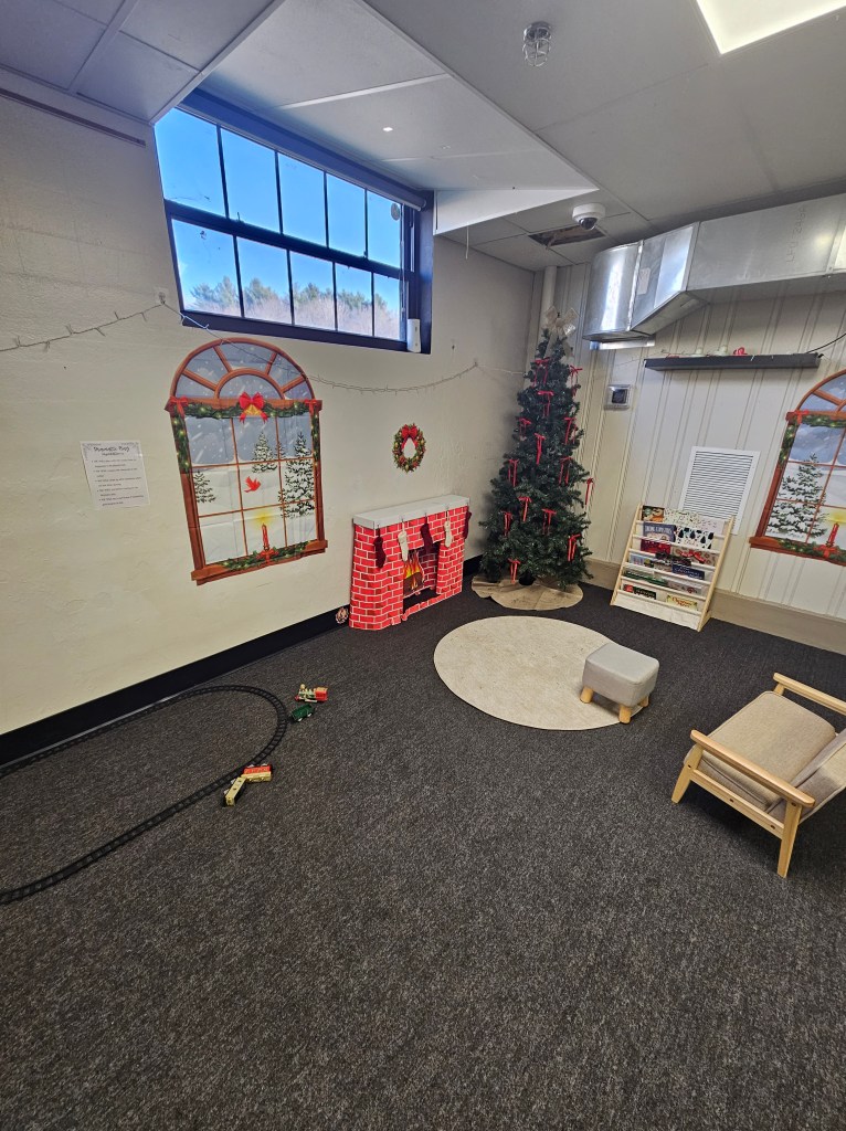 On the upstairs or in the gym, are play tunnels, bounce houses, ball pits and a three peice pikler triangle climber. It doesn’t sound like a lot but trust me it is. Downstairs you can find coffee for the parents (but it must be enjoyed down here). There is seasonal changing sensory bin, when we were here (during December) the bins were filled with snow like materials. Also set up seasonally there was a corner of all things christmas; a fake fireplace, a tree mittens, etc. Aside from the changing seasonal things, there is a playdough table with ideas if you’re kiddo doesn’t know where to start. A table with a big bucket of crayons and coloring pages nearby. A cute little nook, filled with pillows and a pretty light aquarium is down here too but never occupied. The toys consist of trucks, diplos, farm animals, stuffys, place mats for matching and a few other obscure but obvious choice toys.