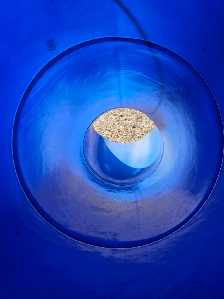 The structure is made to look like a boat. Fitting because of you look out towards that small field I mentioned is a view of water with boats going by occasionally. Near the bow of this boat made of steel bars, easy for climbing, are two tunnels below and they just lead underneath the slides on the other side. To get up on top of this structure you can choose a curved ladder, there’s two on each side, or the steps. At the top of any one of these climbing designs, it is one giant platform with two tubular covered slices on each side. There are some finger mazes and one steering wheel towards the front or the bow of the boat is.
