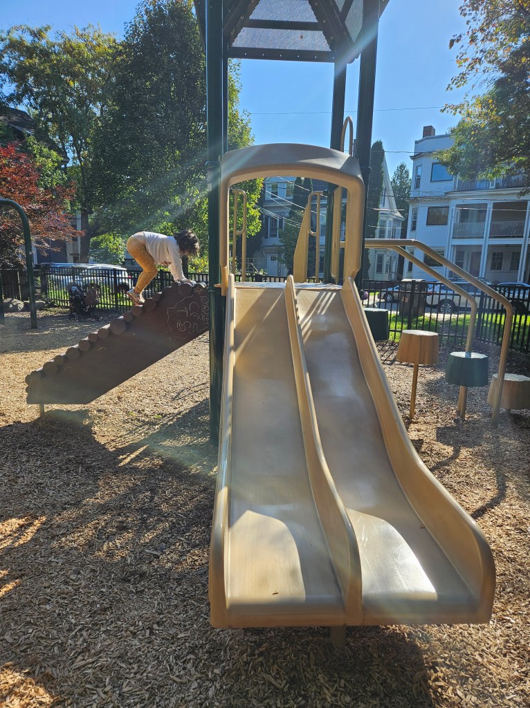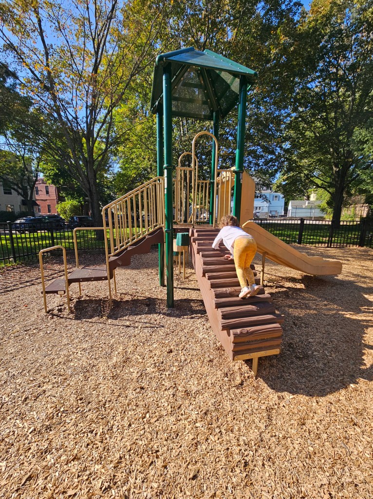 If you follow GPS you should have no problem finding this playground but parking might be difficult. It’s in the west end of Portland so parking is street parking. I went early enough I think to find a spot just outside the fenced in playground. There are no bathrooms and it is partially shaded. This playground is in walking distance from a Cafe, where you can get sandwiches, coffee and pastries.