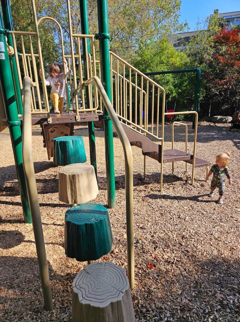 This playground is most suitable for kids around two years old and under but I suggest they be able to walk and climb to really take advantage of this playground. The coffee shop nearby is enticing for those pushing their kid in a stroller. My four year old got bored very fast here, although she really liked the climbing logs. If you live in the west end and are looking for a quick place to get your kid out, this is a nice little stop. I would not make this playground your final or main destination as it’s small, there isn’t a lot to do nor is there anything here that most playgrounds have and if you have kids in a different age range, the older one will likely get bored quickly. Plus with the parking being so hit or miss, you’re better off going to a more open, less secluded playground that can entertain for a bit longer and for more than one age group.