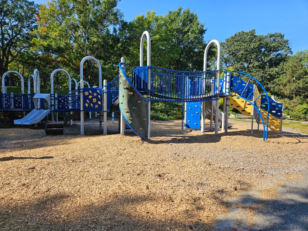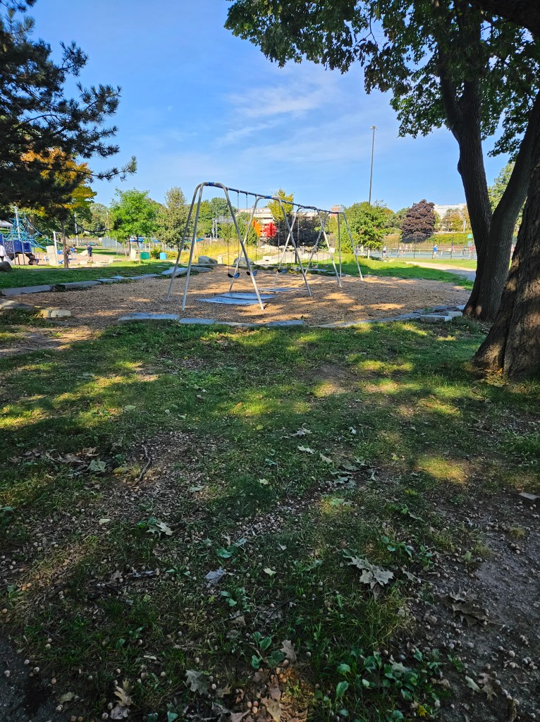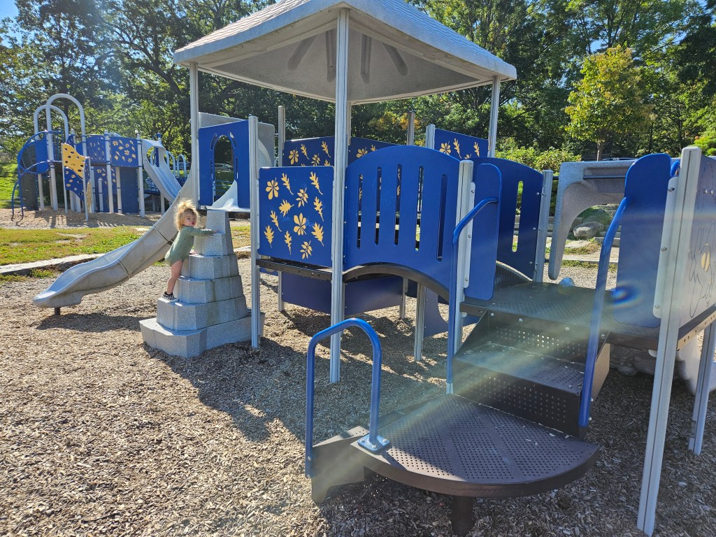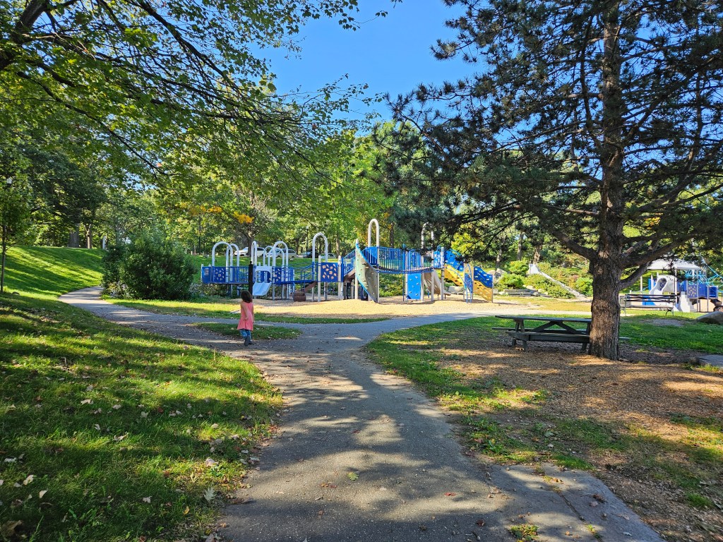 This playground has so much to do and for all ages. I’ve seen kids up to 10 here! With both the big playground and toddler playground in relatively close proximity and benches nearby, it’s perfect for sitting back on a bench and watching your kids on both of the playgrounds. The nearby water areas are essential to us in the summer or on hot days. The fields for running and playing are endless, both near thr playground and near the ravine. There us a duck/goose pond as well. This playground is so worth going to! I suggest packing a lunch, maybe a snack for the ducks (not bread), grab an extra pair of clothes or a bathing suit for playtime in the water and you’ve got half a day at least to spend here.