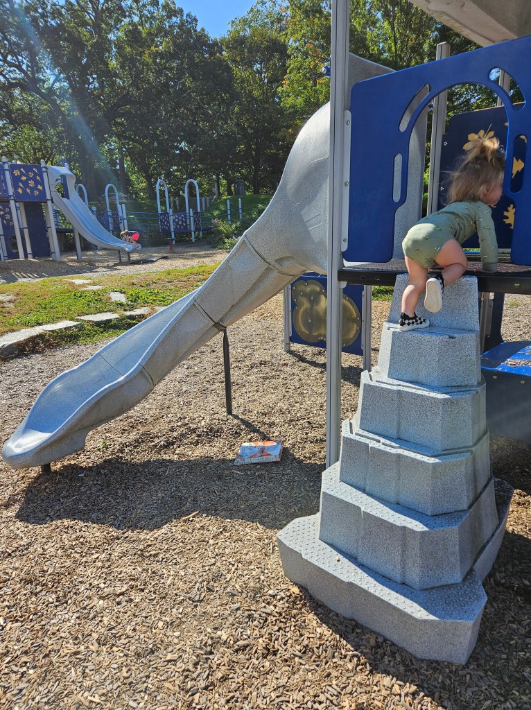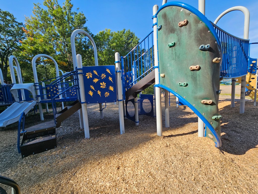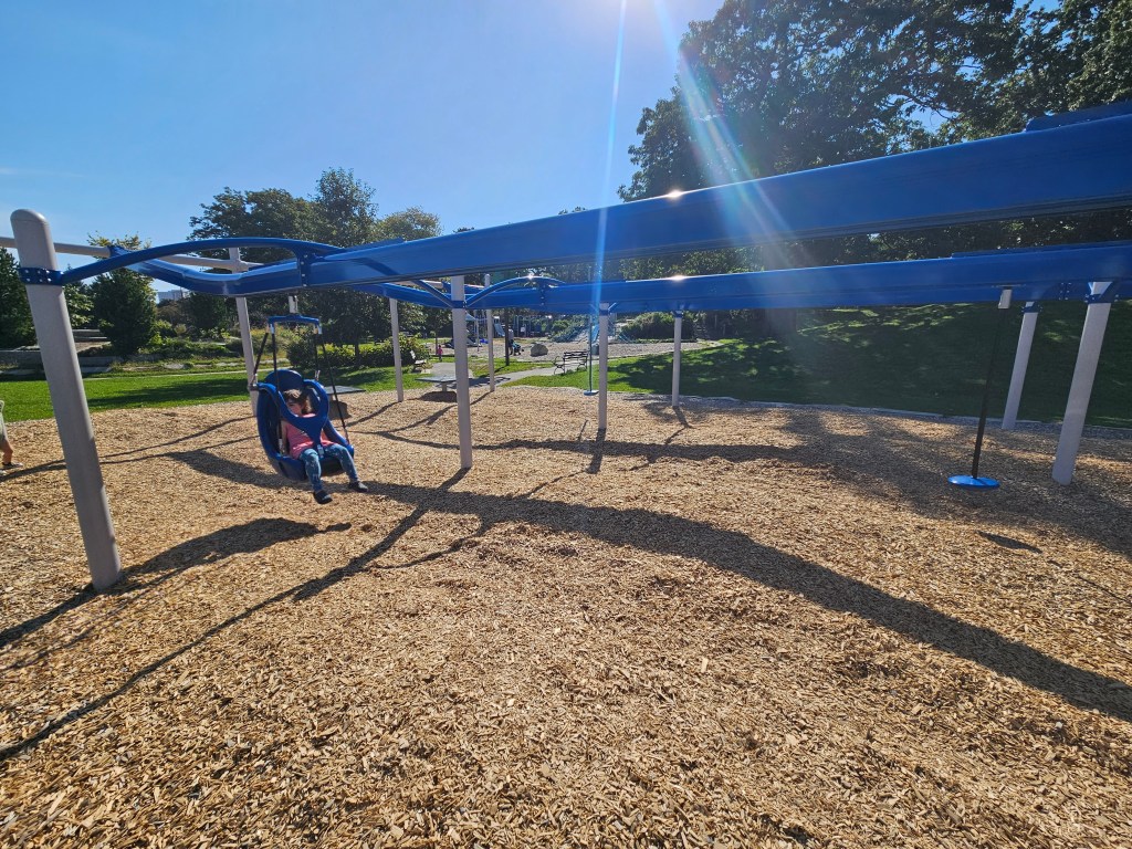 You’ll see a set of swings, I think four, all regular swings under shade. Continue on the path and come to the BIG playground. There are many ways up, including but not limited to, rock walls, ramps, ladders and steps. The top of the playground goes fairly high but there are some areas toddlers could use. At the very top is a double slide that is steep. On one of the sides is a smaller double slide, most accessible near the small steps. The rock walls are tall and there is a variety of them. There’s a long fire pole and a metal circular tube with square holes to look in or outward. There are some balancing seats nearby. One wobbles on a spring and the other moves with the weight of the child. Every board wall on this section of the playground has some sort of entertainment, mazes, knobs, etc.