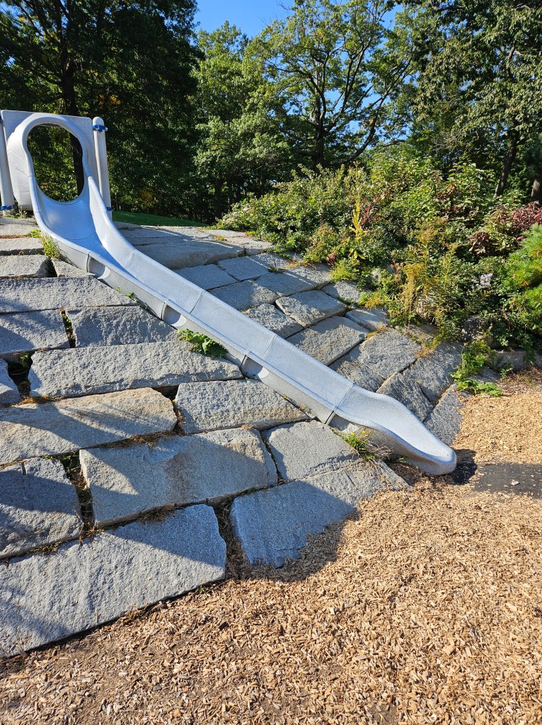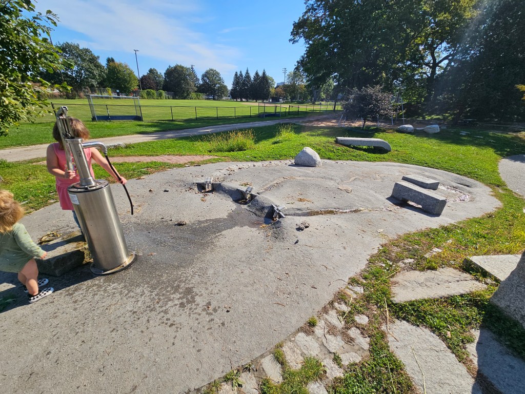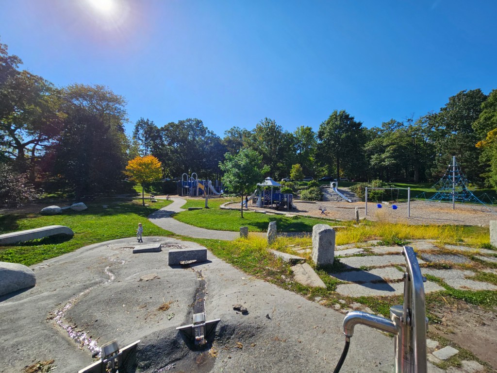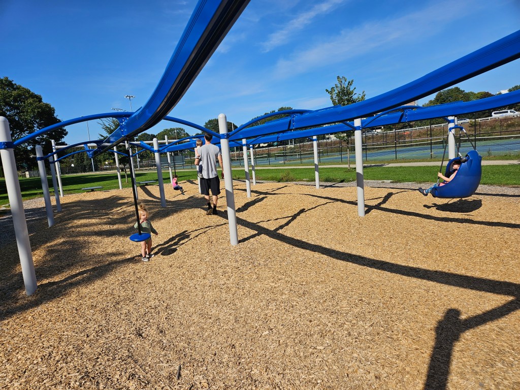 There are some stand alone piece of equipment. Across from the toddler playground is a big curved slide built into giant stones. To get up you can climb these very steep stones or take the stairs to the left. Next to the toddler area is a four person see-saw and a set of baby swings. Next to the swings is a ginormous spider web climbing net. Behind the the toddler playground is a water pump. Kids pump the water and it flows down any of the three paths depending on which flaps kids have chosen to close or open. Tennis courts are behind this. Diagonally from the spiderweb web is what I call the rollercoaster area. There are two circular seats, kids wrap there feet around and hold on tight. There is also a swinging chair that locks. These three things are then pulled to the top and pushed down by parents. The kids ride to the bottom and it comes backwards back to about the middle. There is a field next to this as well as a sanded volleyball court. In the summer, our favorite, is the ravine and splash pad. There’s a bit of a walk to get there but it’s worth it. The ravine, which was closed at this visit, is filled with water from Sebago lake. It reaches up to about a foot of water and getting lower and lower as you enter the splash pad. It is partially shaded so it can ve kind of chilly in the shade. We usually do the ravine first then walk over to the playground so they can dry off in the mostly sun covered playground.