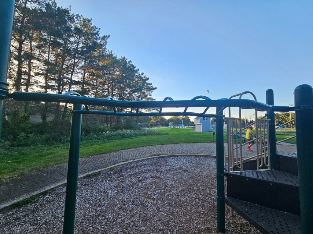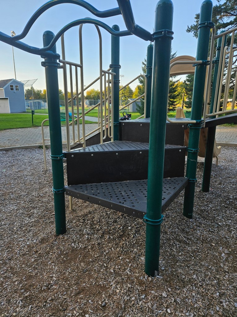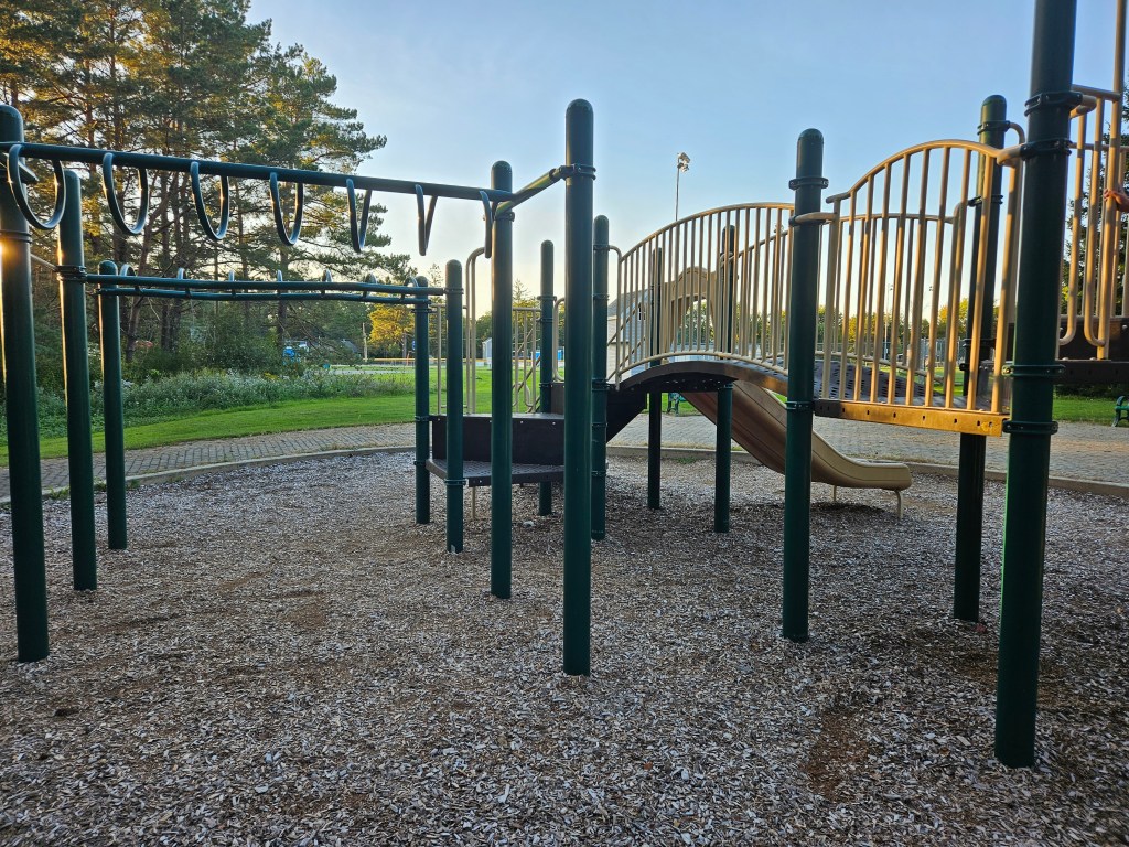 Walking up, the playground is in the center of a circular walkway/path. There are some benches off to the side of the perimeter. One way up this playground is easy steps. At the top of these steps, to the left is a double slide. To the right, another set of steps leading to an opening for a small fire pole. If not the fire pole, a bigger opening for the handle bars that have a slight challenge being that they’re curved upwards. Next to this is a singular handle bar to use to get to the next set of spiral handle bars. Back to the beginning where the steps are, if you skip the bars, kid can cross a humped bridge. At the end of it is the opening for the spiral ladder and to the left a big twisty slide. I went on this a few times and it was a pretty fast ride.