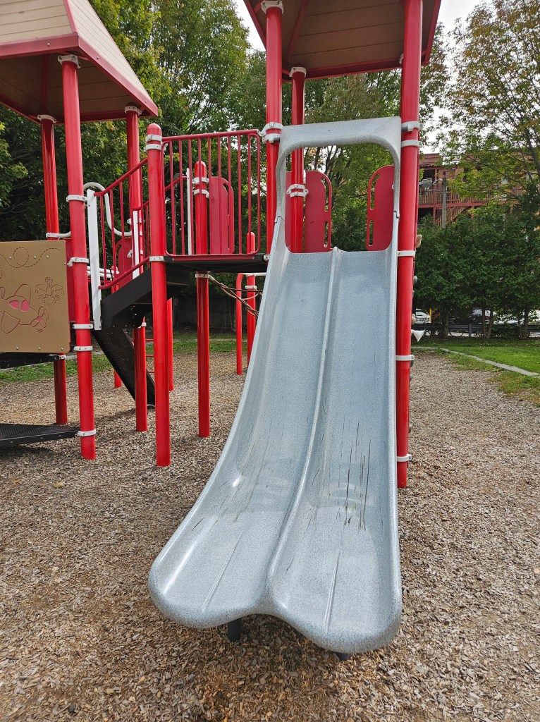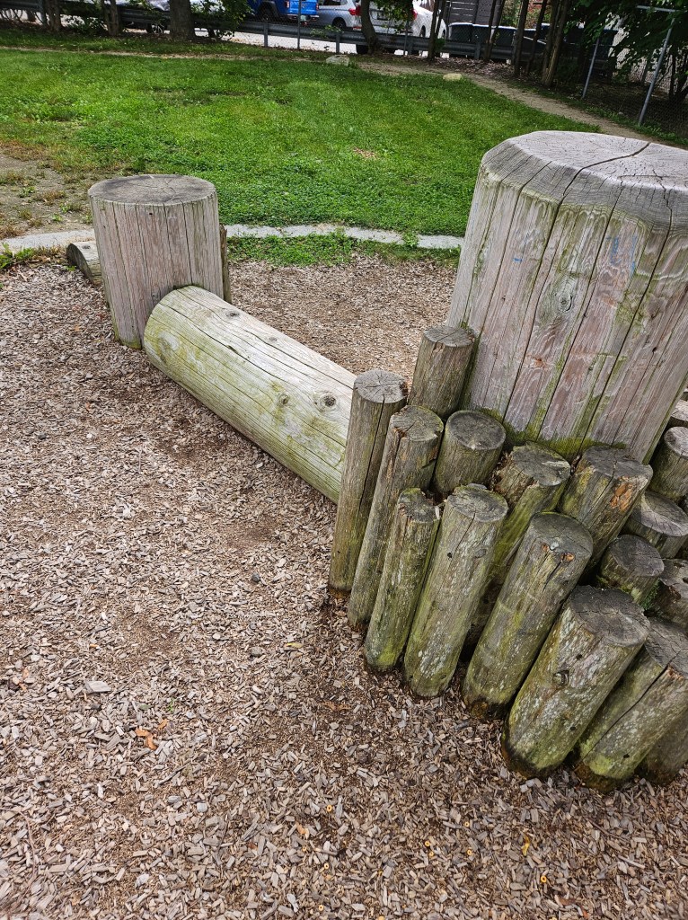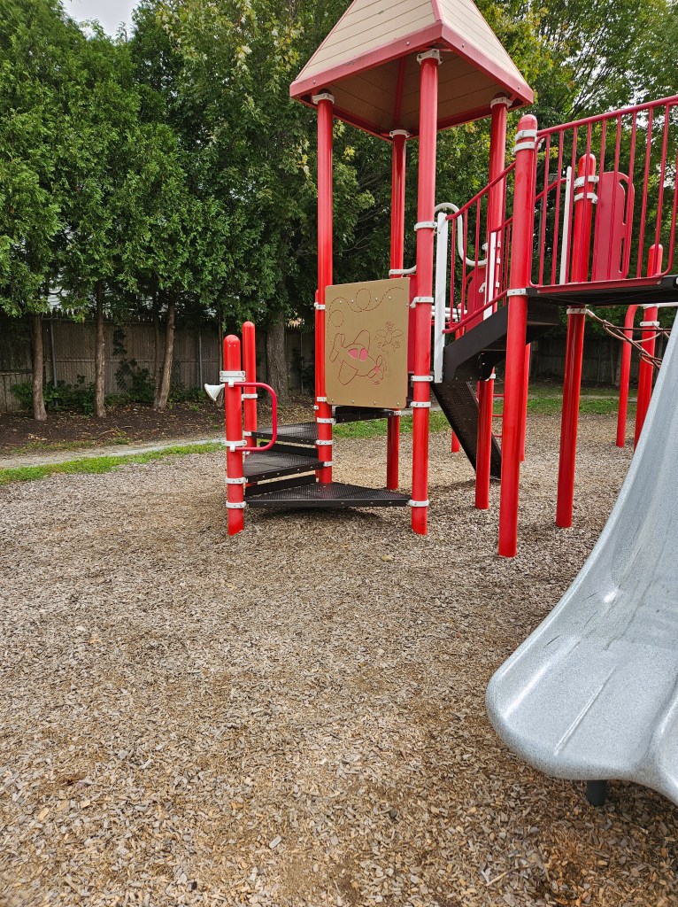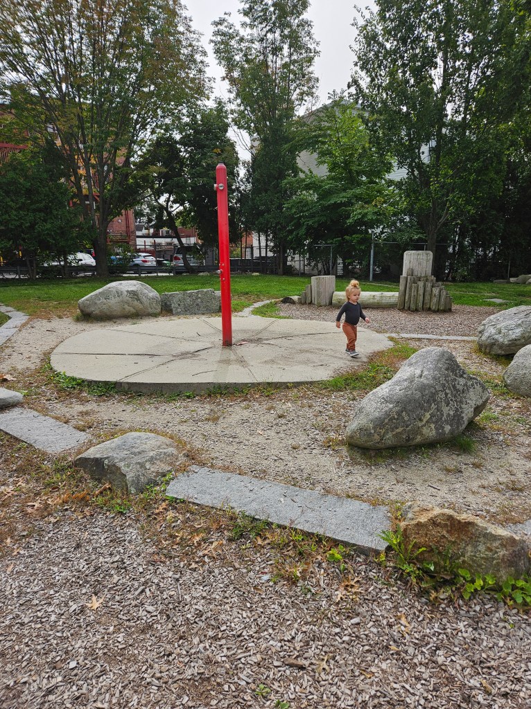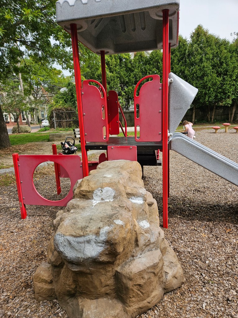 This playground is mostly fenced in and is spaced out nicely. I like the various things to do and I’m sure during the summer it can get busy with the sprinkler being a main attraction. It is plenty shaded and there are places for parents to sit, whether it’s one of the natural logs or the one bench provided. It doesn’t have a bathroom and parking could be tricky on a busy day. I went in the morning on a school day so I was pretty lucky to have snag the parking spot I did. If you don’t park on Cumberland Ave and you follow the GPS directions, there is street parking there too and a small path that leads into the playground. I recommend this play ground for all ages. My kids used both the toddler structure and the bigger structure with no issues regarding their size. Of course my 18m couldn’t do anything more than the steps but he was fine with that! My 4y who typically doesn’t do slides all that much was all over the steep double slide, especially when I was with her. This playground is definitely worth checking out and definitely definitely worth checking out in the summer as a means to cool off!