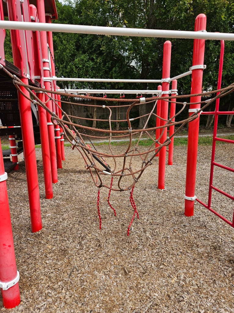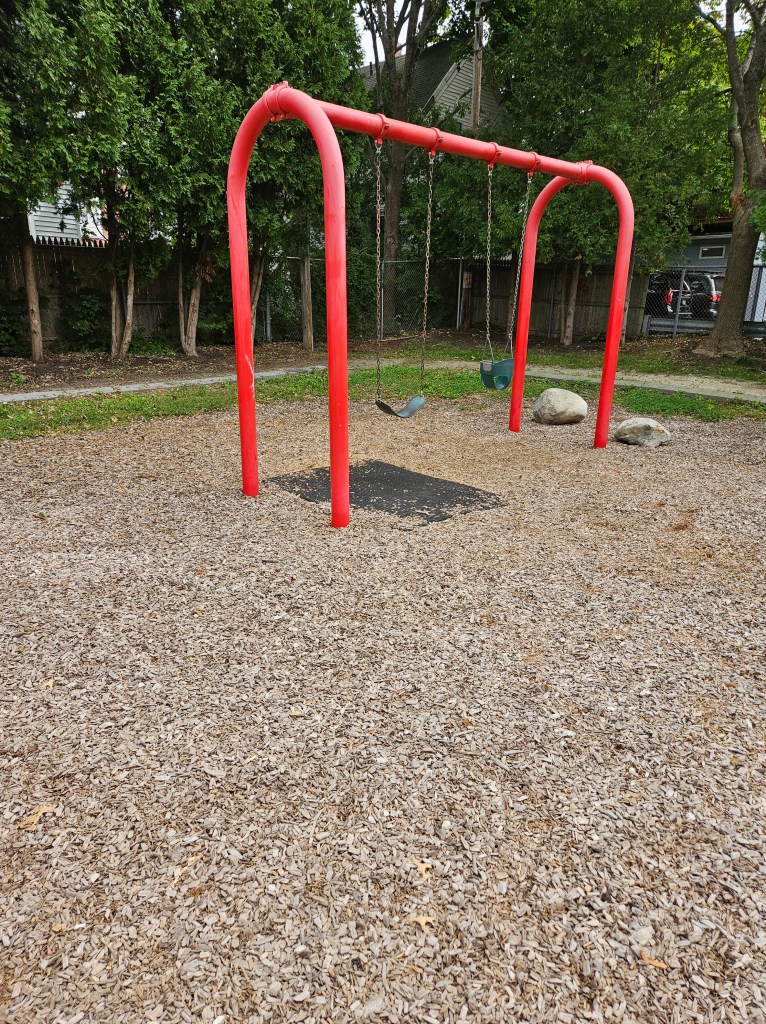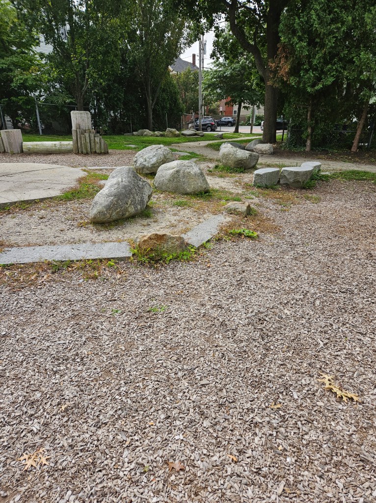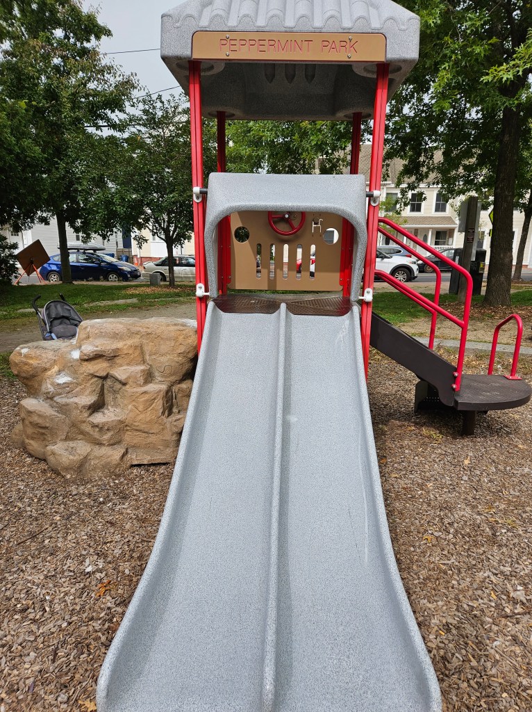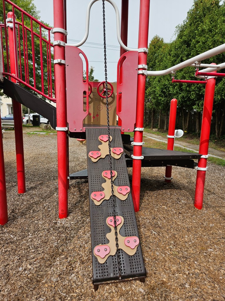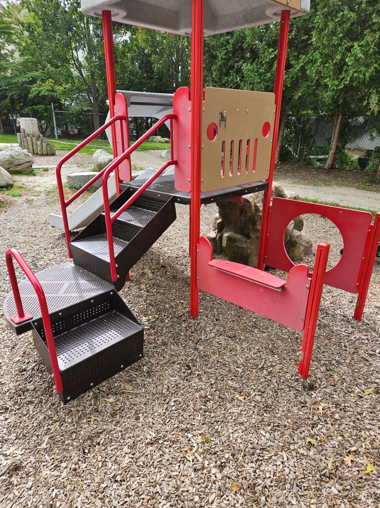 This playground is mostly fenced in and is spaced out nicely. I like the various things to do and I’m sure during the summer it can get busy with the sprinkler being a main attraction. It is plenty shaded and there are places for parents to sit, whether it’s one of the natural logs or the one bench provided. It doesn’t have a bathroom and parking could be tricky on a busy day. I went in the morning on a school day so I was pretty lucky to have snag the parking spot I did. If you don’t park on Cumberland Ave and you follow the GPS directions, there is street parking there too and a small path that leads into the playground. I recommend this play ground for all ages. My kids used both the toddler structure and the bigger structure with no issues regarding their size. Of course my 18m couldn’t do anything more than the steps but he was fine with that! My 4y who typically doesn’t do slides all that much was all over the steep double slide, especially when I was with her. This playground is definitely worth checking out and definitely definitely worth checking out in the summer as a means to cool off!