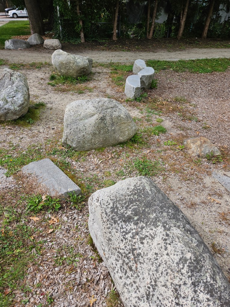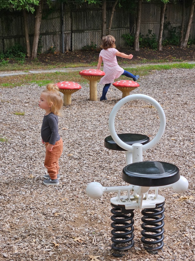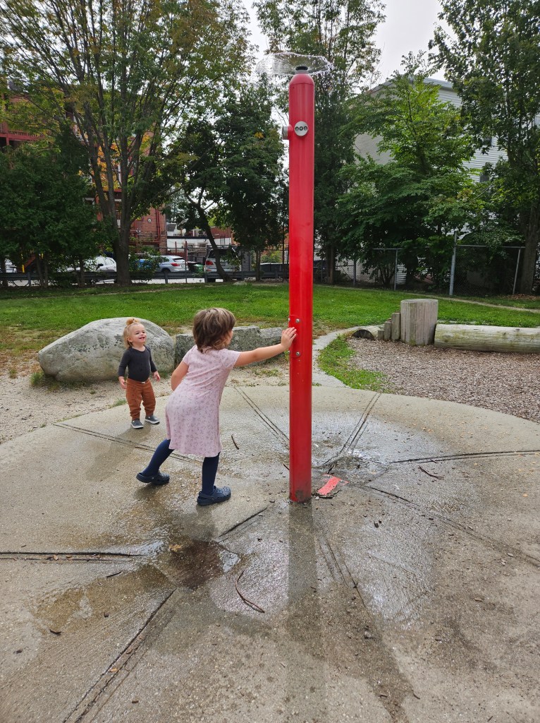 There are a few various stand alone pieces of equipment and a cute little path that just circles the playground but it can easily be used as another way of playing. My kids pretended to be sonic and tails and run as fast as they could around it. The stand alone equipment was also a big hit with my 18m and 4y. There’s a small rocking seesaw thing. I fit on this just fine and was able to spring us back and forth. There is a set of adorable mushrooms for sitting, climbing or balancing from one to another. Various size rocks and logs are scattered around the playground for some good balance and climbing practice. There is a swingset with one bucket swing and one regular swing. The bread winner for my kids, although I protested against it and lost the battle, was a sprinkler splash pad. It’s one tall pole with a button to press to activate the water. The water sprays in an umbrella form for about 15 seconds unless being held consistently. The drain doesn’t seem to work well so lots of water collects into muddy puddles.