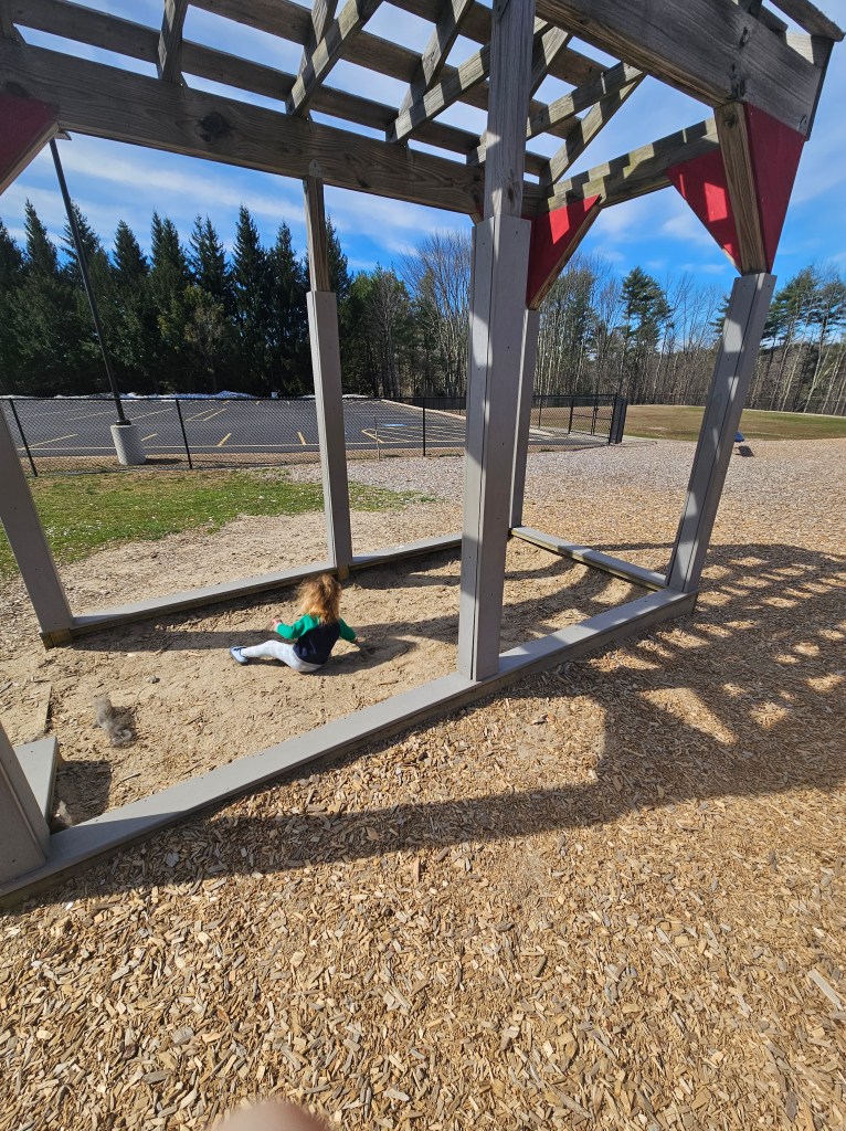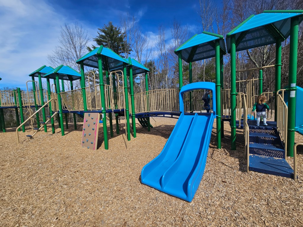 This third playground is furthest away and is visible from playground number two. It is also the biggest of the three structures at this location. With that said my two year old has zero problems going up and down on the climbing poles he was comfortable with. Walking up to this playground you’ll find one picnic table and to the left of it is a sandbox. The sandbox could use some work but my 2yo loves sand so even the little that was there was enough. There are now toys or trucks of that matter though so it may just end in lots of sand throwing. In front of the table is the structure.