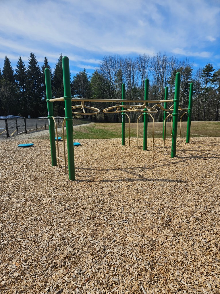 There’s a few things around the playground worth noting. One is the handlebar structure. It is made up of different types of handlebars. Next to that is three balance boards on springs very close to the ground. There are some higher off the ground ones nearby. Near the picnic table is a swing set with four regular seats.