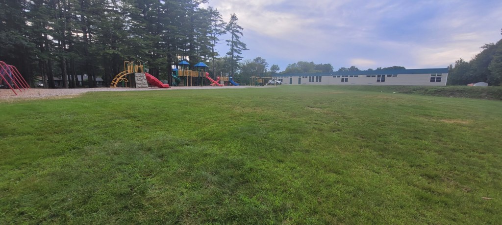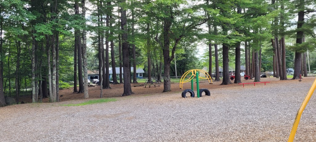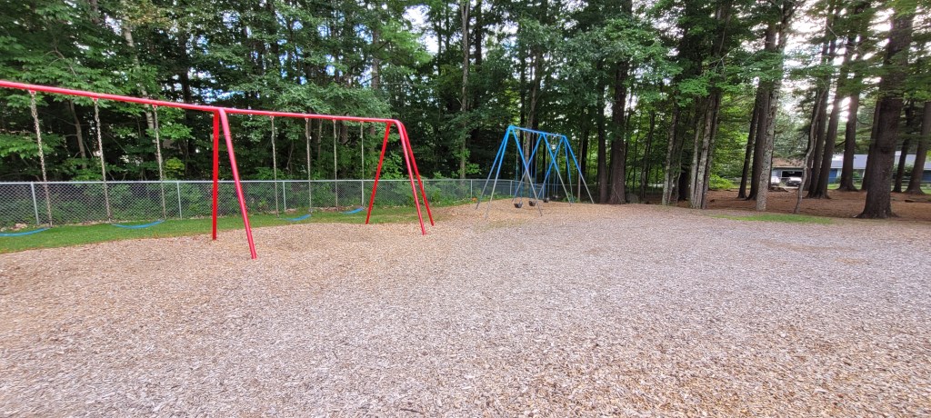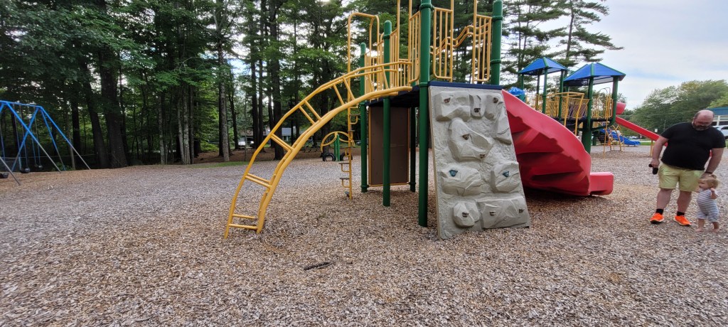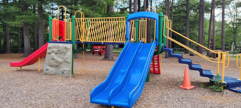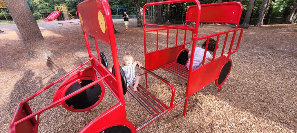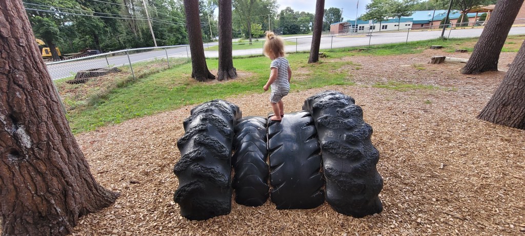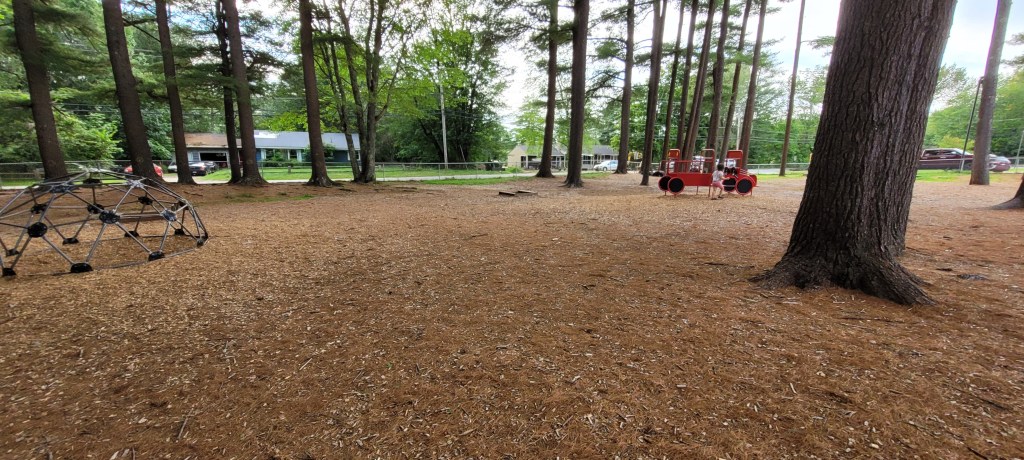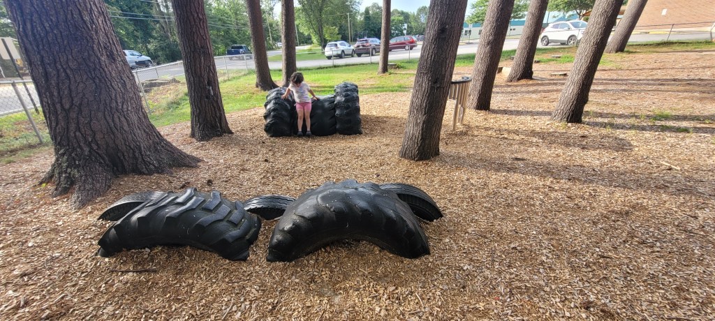 The equipment scattered around were the winning stars for my kids. A balance beam and a standing see-saw were used heavily by them. There’s a standing spinning toy that they each tried but neither were huge fans. Go into the trees nearby to find a metal firetruck they can sit in the back and ride in or jump in the front seat and steer it. In the same area is a dome climber and two small sandboxes, which at this time were not well kept. Further into the trees are sets of tires to climb, balance and slide from, a huge hit with my 17m. There are some tree stumps to climb on and they aren’t high off the ground so he felt comfortable there too. A small balancing log is connected to a tree and one of the stumps. The trees are scattered enough that you could have an epic game of hide and seek but there’s not so many that you actually think you lost your kid, plus there’s a fence preventing them from leaving the area. Opposite this area and next to the playgrounds is a field for anyone looking to kick a ball, throw a ball back and fourth.