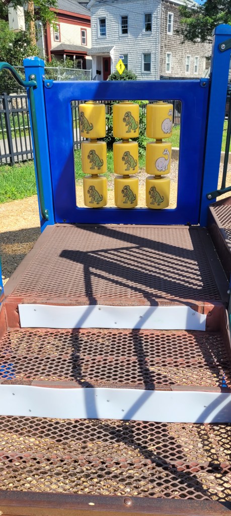 On your way to the second, smaller playground you can stop and take a spin on the mushroom shaped post or the buckets swings for little ones. The sturcture has a small set of stairs up and they come to a came of tic-tac-toe, except instead of x’s and o’s it’s dinosaurs. Follow the small steps up to three slides. The first is a double slide and its small best suited for toddlers. Another slide is partially covered and straight down. The other is a open twisty slide. The other ways up to these slides is a slightly slanted open hole wall, a moving block ladder type thing and a two step bar ladder.