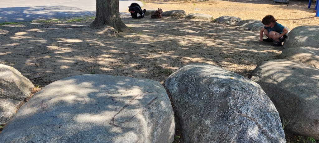 There is another swingset along the length of the big playground and it has only regular kid swings. Next to the swing set is nicely shaded with a dozen big boulders that both, my 4y and 17m old, loved to climb and hop on, counting them along the way.