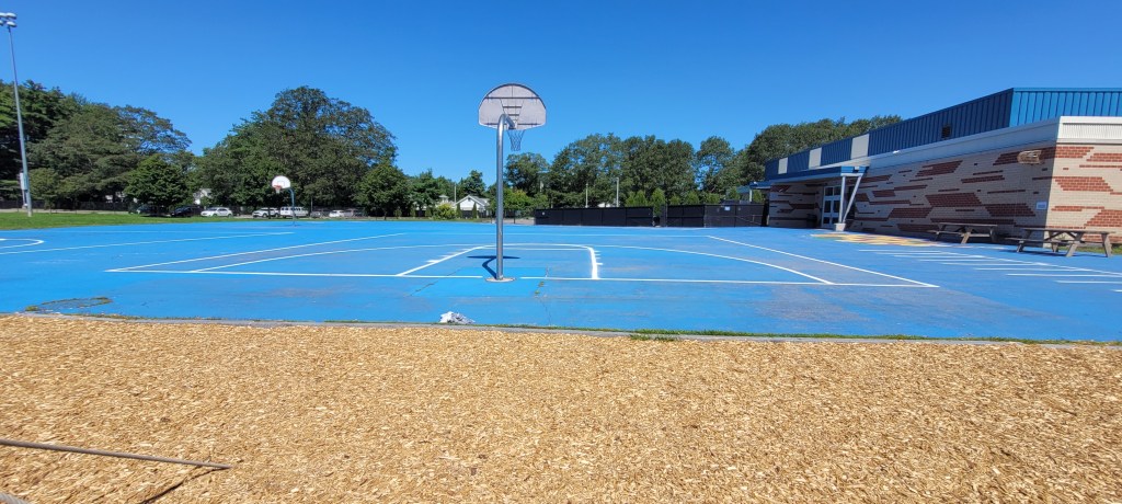 There is a ginormous basketball court and field. Across the field is a porty potty, I’m glad we didn’t need to use it because it probably would’ve taken all of our energy to get to and from it. There are some shady spots but for the most part it’s completely in the sun. We came on a Wednesday mid morning and it was very busy.