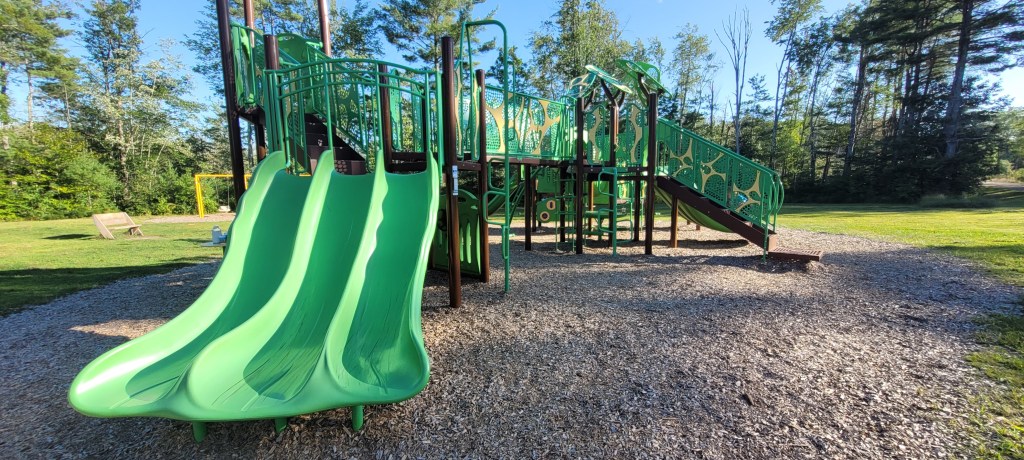 This hidden gem is off of route 302 in Windham, Maine. We visit this park most. Parking is easy to find even on the busiest days. The playground is right across from the dirt and gravel parking lot.