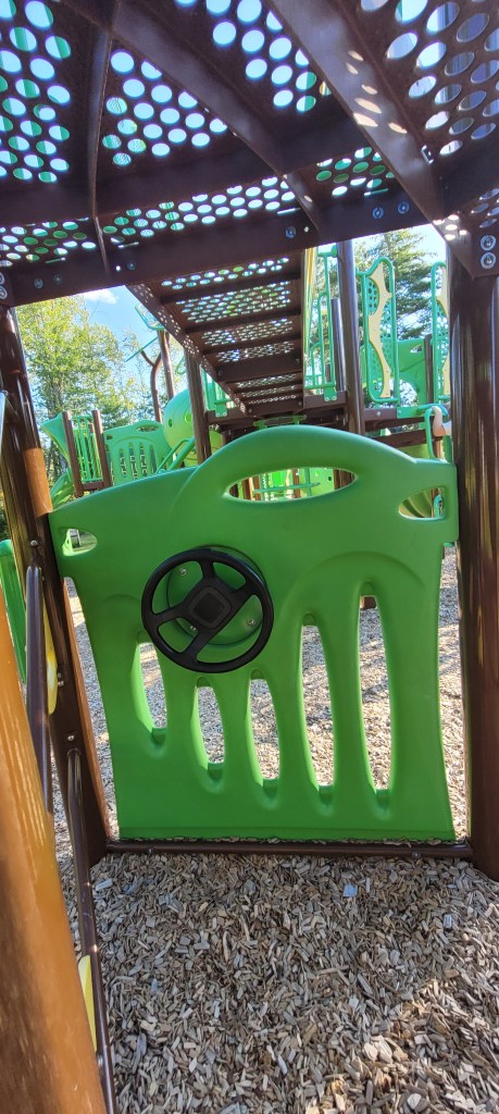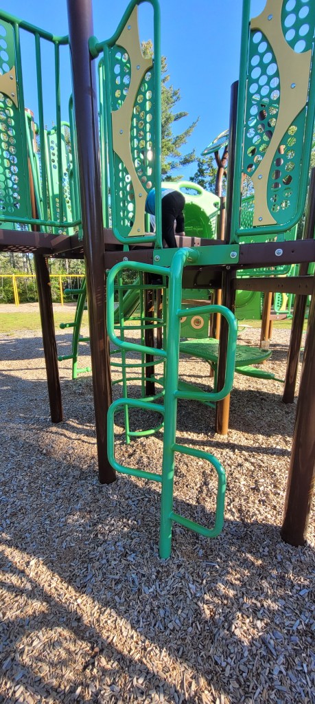 The playground is fairly big, although just one structure. It’s bright blue and green colors are inviting. There’s a few ways up, regular steps, an alternating foot ladder thing, a small ladder and some leaf shaped steps.