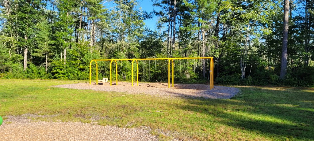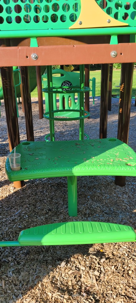 Behind the playground is a big swingset. It has one of those parent and me swings, where parent sits on one side and baby or toddler on the other. There’s on bucket swing and four regular swings. Some benches and a table are around here.