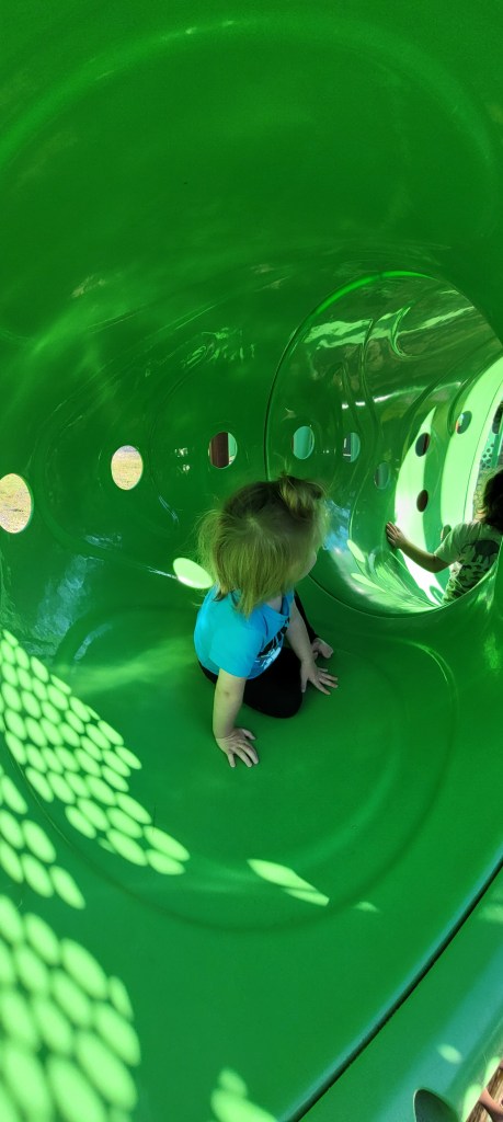 Atop is a narrow bridge that leads to three connected slides and a very high up slide. My 4y won’t attempt it but my wild 17m old loves it. Opposite the bridge is two bright green tunnels that also act as slides and climbers. There’s more connected slides and one small singular slide. Along the two walls is a finger tracing board and a steering wheel type thing that makes noise as you spin it.
