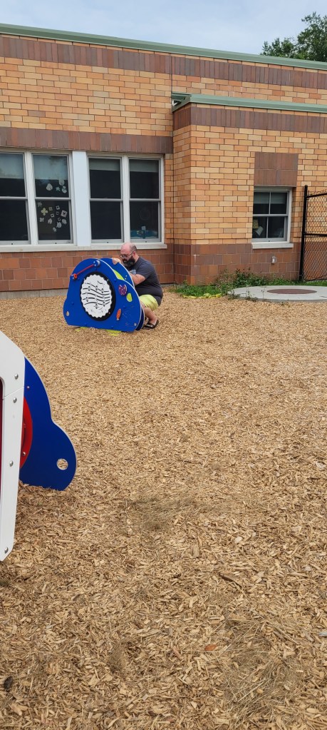 There’s some swings and a tire swing near by. My kids favorite thing at this play ground was the merry-go-round. There 5 or 6 dipped in seats and the parent can spin as fast or slow as needed. On the court is a bright painted picture of the US, some hopscotch and four square blocks. There a lengthy sandbox with some toys scattered inside. I thought this is where my son would play but it didn’t hold his interest. In front of that is a climbing dome.