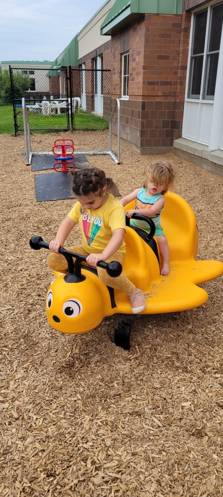 The third playground here is geared towards toddlers and pre-k. The structures are much smaller and closer to the ground. A smaller climbing dome is here along with smaller slides and a cute little bumble bee ride on thing. There’s a balance beam that leads to a few round platforms on at various heights.