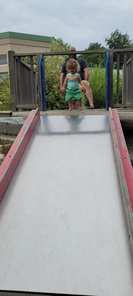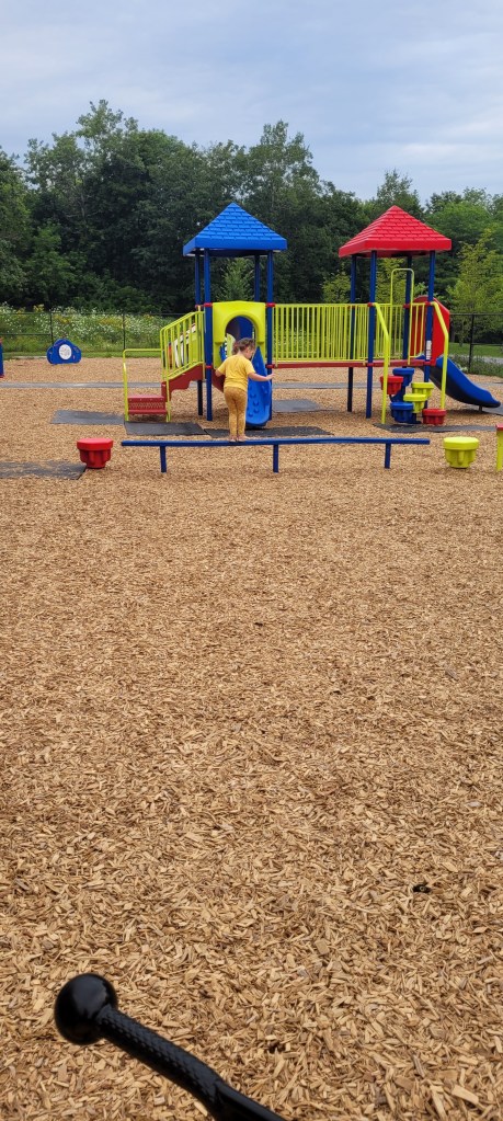 The three of these playgrounds combined make this playground worth checking out for toddlers and up. Between the three, there is plenty to do for kids with lots of pent up energy. We went after hours in a weekday so it was not busy at all and we were the only family there. I would imagine those who know of this playground flock to it on the weekends. Another perc to the William H Rowe playground is that is directly next to royal river park so there’s a well maintenance path and field. We talked about coming back and doing a picnic in the field after walking the trail to see the waterfall. We saw a lot of people with and without dogs walking the trail.