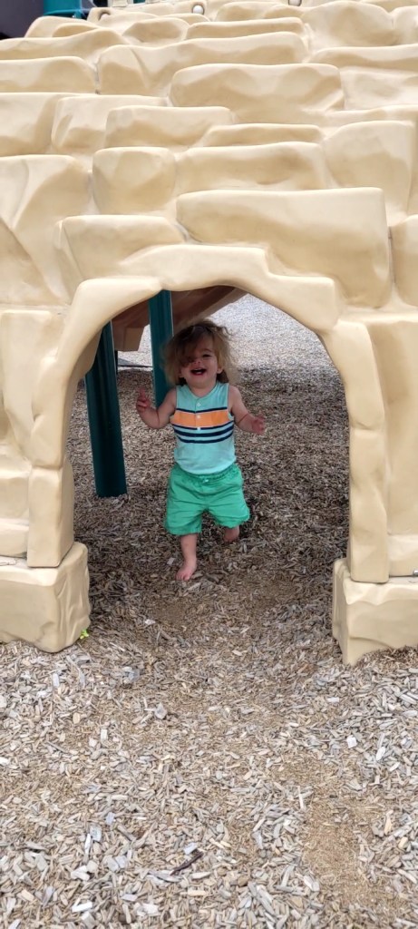 The first playground here, yes there are multiples, is an suitable for all ages. My 17m and 4y played together on it while I walked the perimeter just in case, as there are some openings toddlers would more than likely walk through. It has a couple slides and a fancy rock wall. My son could climb it up but not down. My daughter is a master at these and did it no problem. Six small round platforms form a wobbly bridge so to speak for littles to step across.