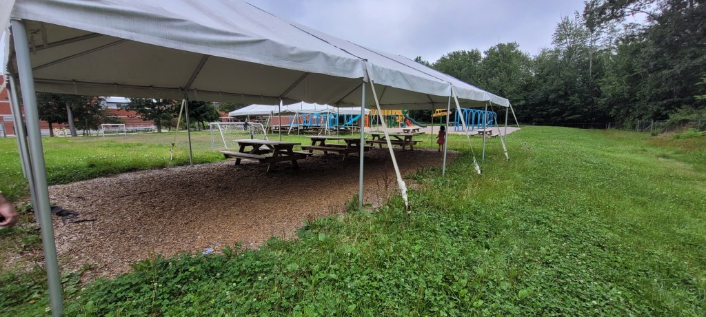There’s two tents shading lots of tables and benches for those summer days that feel borderline like h e double hockey sticks.