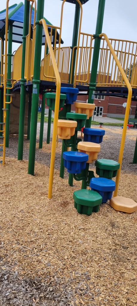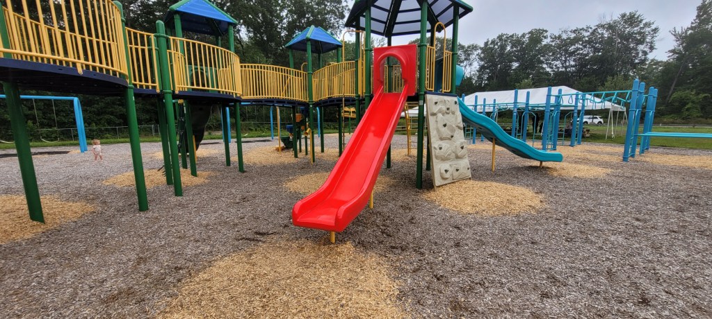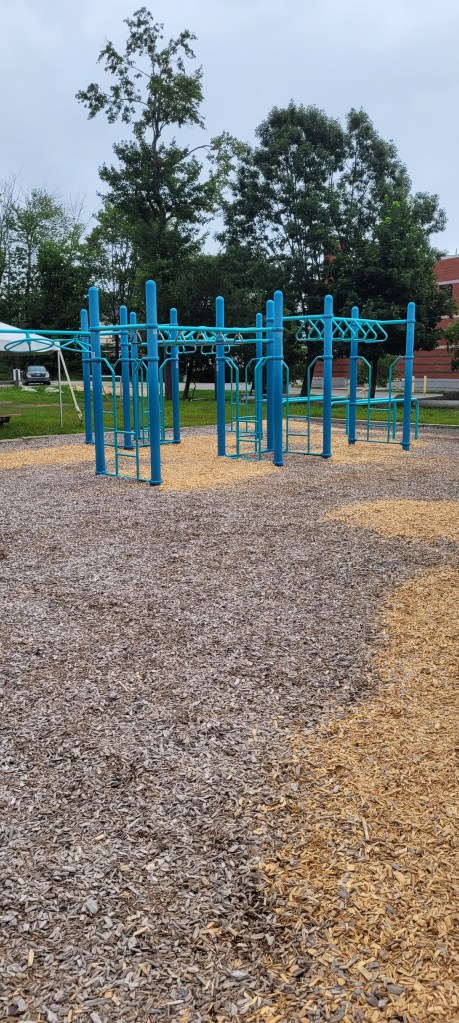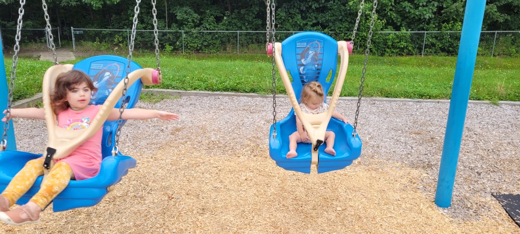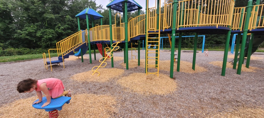 Separate from the playground was a structure of various monkey bars. My 4y doesn’t like monkey bars but there was a nifty 3y showing off her skills. There’s a yellow hanging spinny thing. Kids hold on and it moves with their weight. Neither of my kids liked this. Behind the playground is a LOTS of swings. No bucket swings but regular swings were not in short supply and the end are two seated swings that “buckle” your kids in. My 17m old LOVED these and my 4y like both types of swings provided.