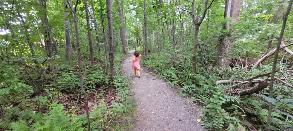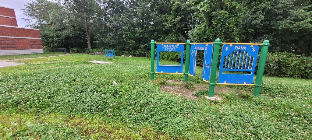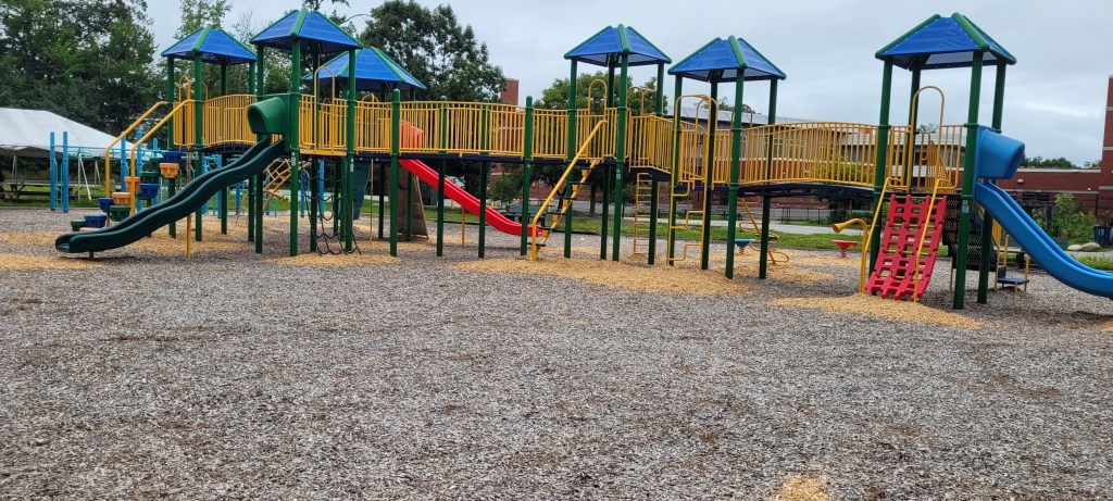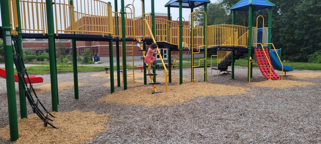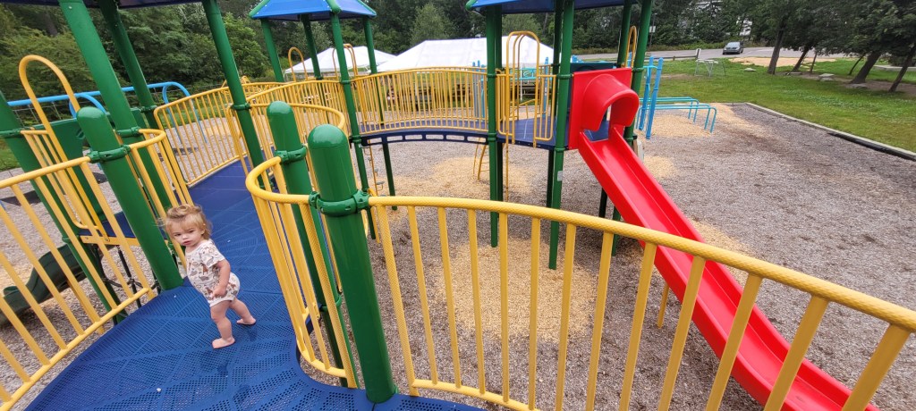 I absolutely love this playground. I wouldn’t take JUST my 17m old here because of the height of the playground (I’d rather not HAVE to hover over him the whole time). But as a family going its perfect because dad and I can switch off hovering while the other plays with our 4y. There’s cute little pretend play shops too that could keep a toddler entertained. The trail is an extra bonus- it’s a good way to cool down after some hard playground playing and there’s chance for a lot of fun on it if your just strolling it. If you have older kids who aren’t playground material they could bring a ball and play any of the various court activities including basketball.