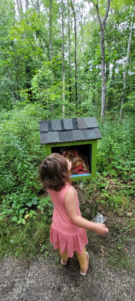 Behind the swings is a small and very easy trail. I say that having took what looked like the shortest path but I could see other paths leading deeper into the woods. Along the path is little boxes on posts with artwork by children at the school. I carried my 2m and my other two walked on their own stopping and checking every single thing out, from broken trees, to plants, snails and the boxes that line the path every so often. This path would be great for some sort of nature scavenger hunt! The path we took led us right back to the playground.