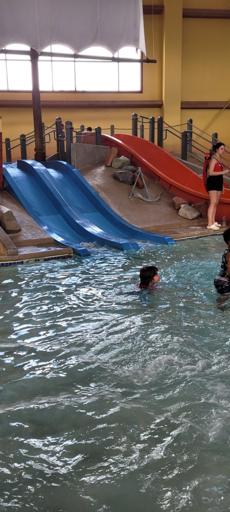 The indoor water park is about an hour and a half from Gray, Maine (where we live). The drive is fair and goes by pretty quickly. I’d plan to stay here for most of the day if not all day. We were here for roughly five hours and easily could’ve stayed the last three hours until closing. There are signs leading to the Waterpark and its parking is easy. There is walk to the building no matter where you park. Tickets are $35 dollars for unlimited play or $30 to play between the hours of 3pm and 7pm, which they call their twilight hours. These prices are for 23 months and up, all others are free.