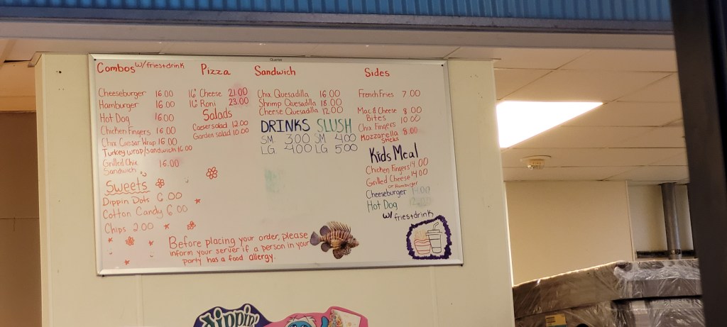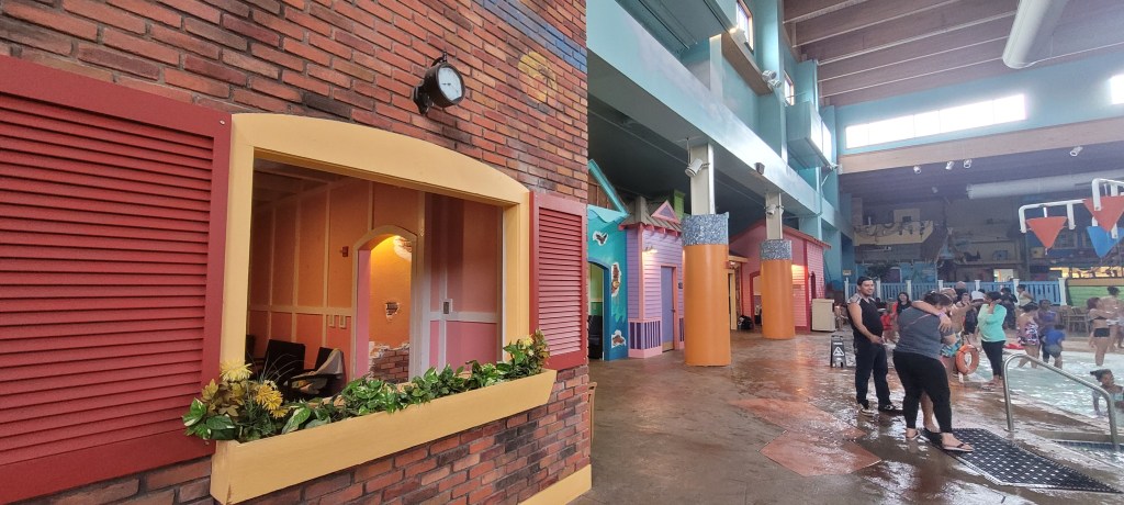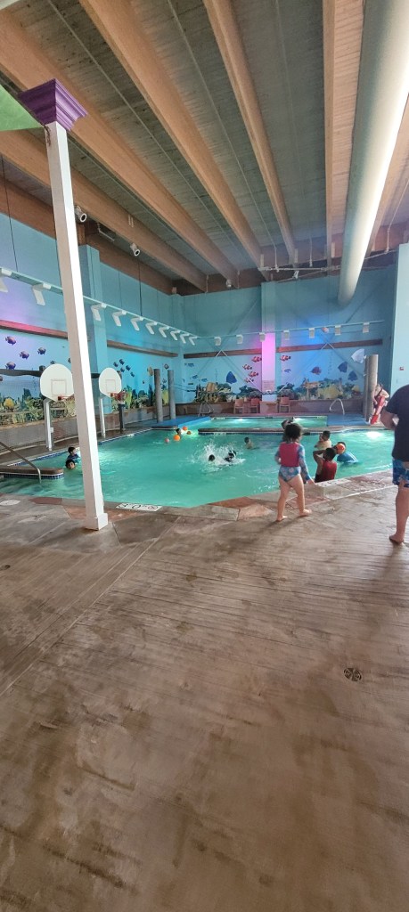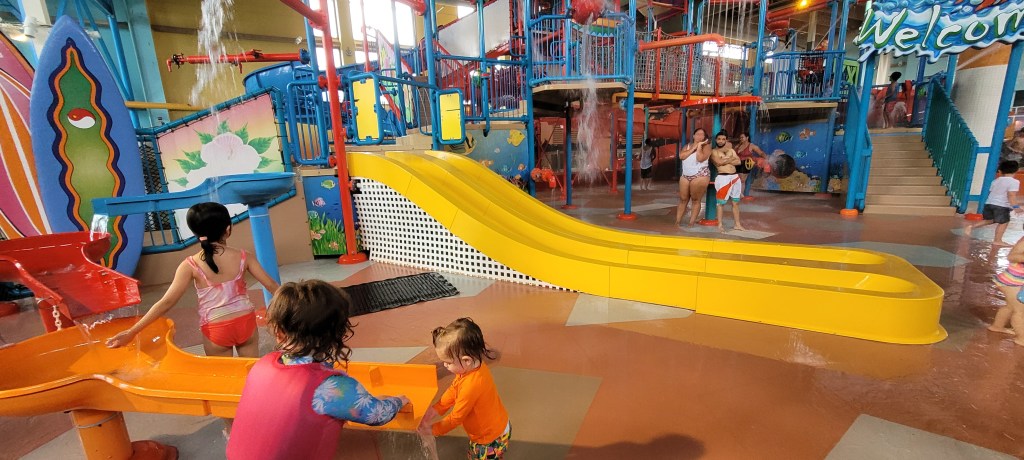 Behind the play sturctures are two pools, one of which was closed at our visit. We had to argue with my 4y to come out and do other things. She quite literally could’ve swam there all day. It is quite crowded as the pool we were in had two basketball hoops. Mostly teens and adults played this, while the young kids just swam around and jumped into the pool. This area is on the dark side but it wasn’t an issue. Near the pools is a hottub, stating only 15 and up allowed in but we saw younger kids in with their parents.