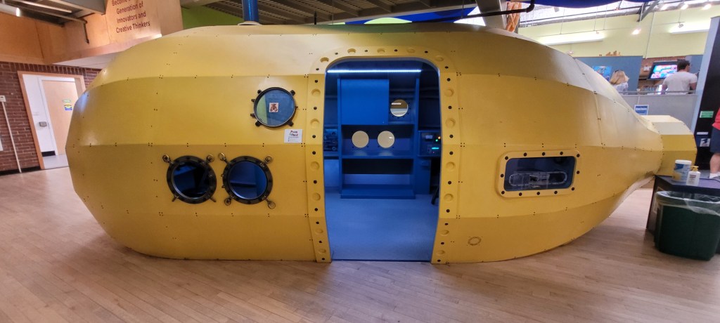The first exhbit is a big, yellow submarine. Inside is three big screens that make make it look like you are driving the submarine. There’s an outlook post but you can’t see anything through it. A sound guessing game is along the back of the submarine. Kids listen to a whale sound and press a button indicating which whale makes that sound. While not a lot to do inside here, my daughter is obsessed with it. If I ever lost sight of her I knew to look over and find her there.