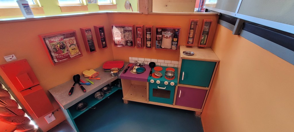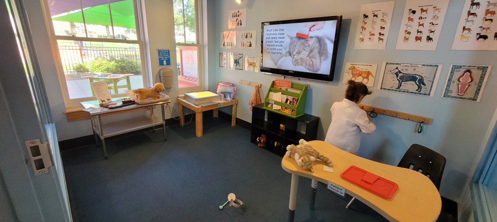 The next exhibit is a veterinary office. Again the small details matter and the designers of this museum knew it. This the best pretend play vets office I’ve seen. It has see through windows so you can see your little vet go to work on some very sick stuffed animals. There’s an x-ray board for each animal. Each animal has a sheet of paper with details about them and their names. There’s supplies for performing a surgery and a wash station. A headset connected to a small pretend laptop sits on a table for the dr. Parents can easily follow their kids in this room if it’s not crowded with kid vet docs. There’s an exit door near here that leads to an outdoor sensory play patio. I’ll talk about that later but let’s complete the inside downstairs.