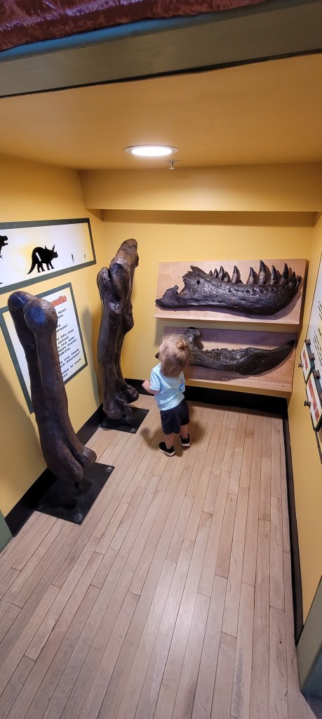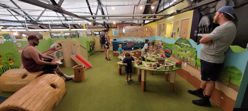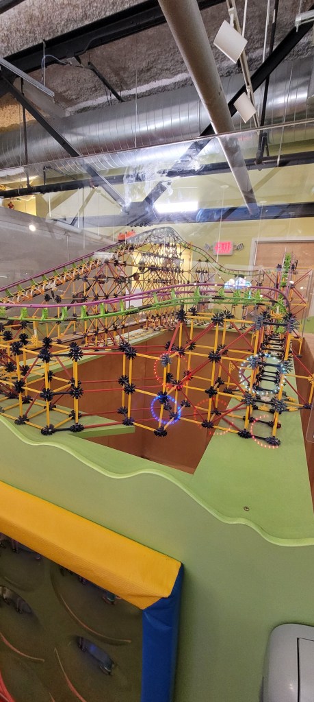 Walking up the ramp to the second floor, you’ll find local art on display. Again, I’m not sure how often this changes but it’s been different each time I’ve gone. There’s really on three exhibits up here, the point of interest being the toddler and baby section. It’s for 4 and under and inside are wooden car tracks with endless possibilities to build a cool track. I’m talking it takes up three, maybe even four wooden tables. On display behind fiber glass is a roller coastr built by what I can only assume is some type of kid toy (like pegs and sticks). Kids are memorized by this for a round or two. A cool wall of different light switches occupies another wall and the toddlers love it. We usually have to wait our turn for it. There’s a small climbing structure and small slide. My 17m old used this now less than a dozen times. There’s a few puzzles on the wall but I don’t see much use of them. Remember details here. Like I said they thought about them when creating this space. If you see the tree, which you will, look closely they have little pretend caterpillar cocoons. Maybe I’m a sucke for these small details but it’s so cute. Off to the side is very small baby area. Not much on the floor play wise but that’s to be expected of a non crawlers area. There so foam blocks and baby books. There’s little puzzles on these walls too. On a sign in a very small corner designates that corner for nursing. Although I nursed through the museum.